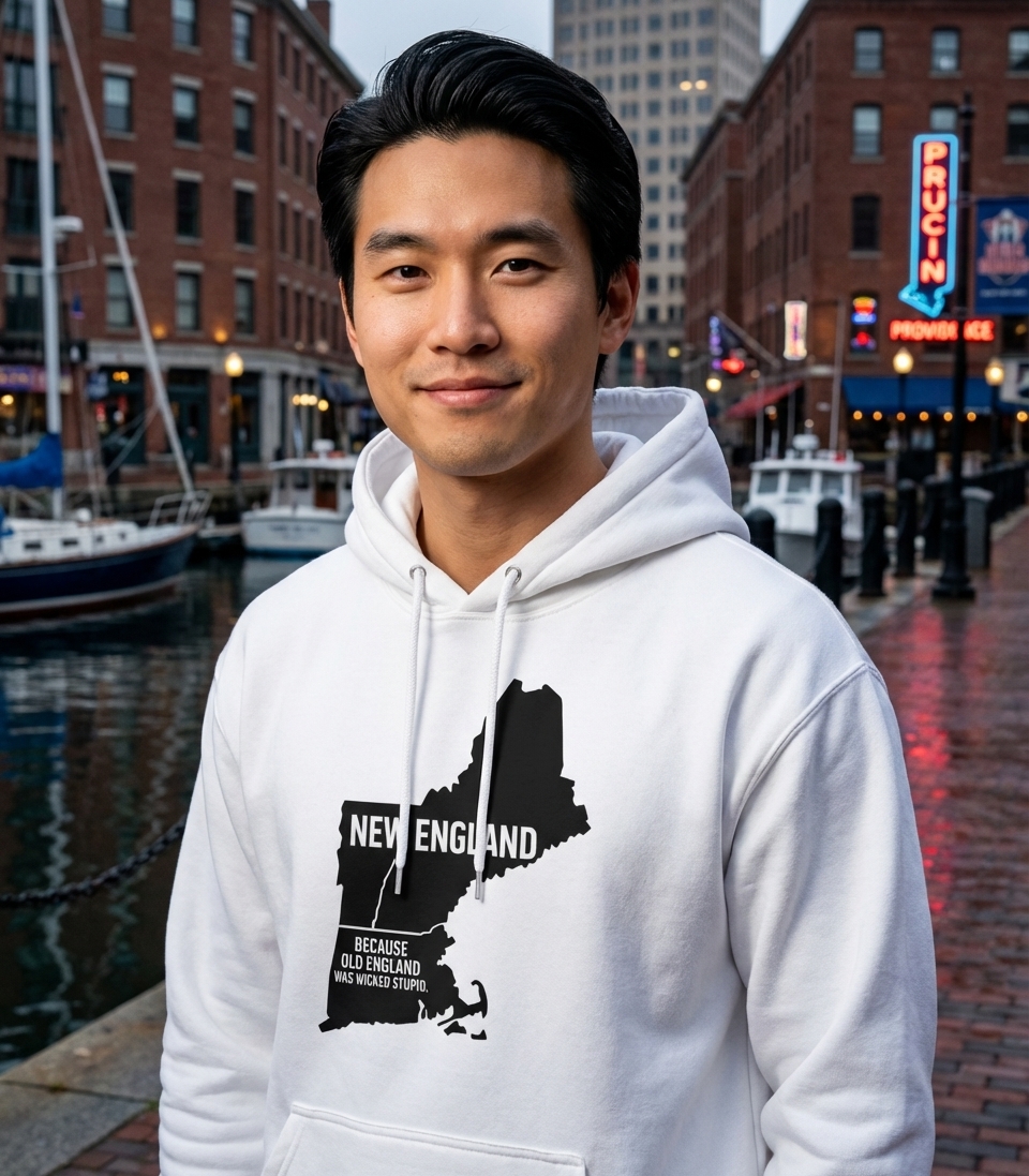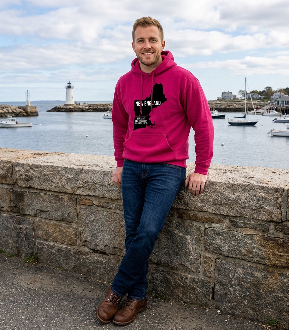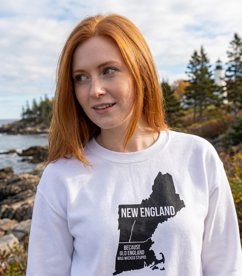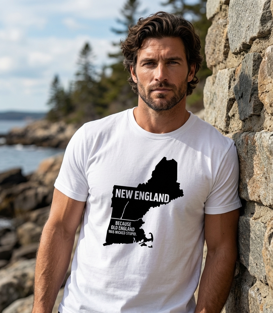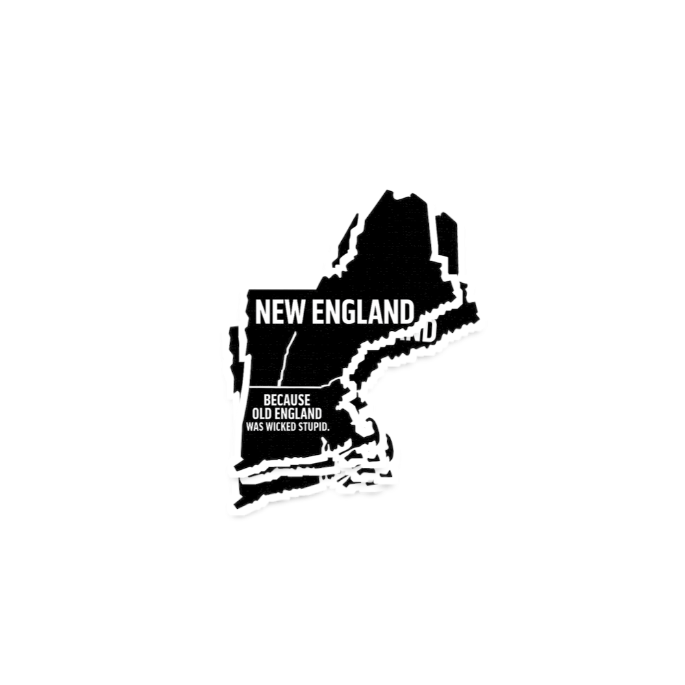 This design makes a bold and humorous statement about New England identity. It features a straightforward, declarative text that captures a distinct regional sensibility.