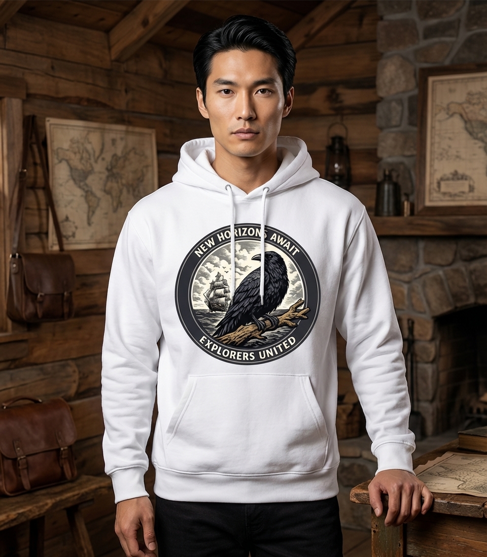 The design features a stoic raven perched on a branch, observing a classic sailing ship upon a dynamic sea. This emblem-style artwork is encircled by the inspiring phrases "New Horizons Await" and "Explorers United," evoking a sense of adventure and collective journey. The artwork uses a vintage illustration style with an earthy color palette, giving it a timeless and rugged feel.