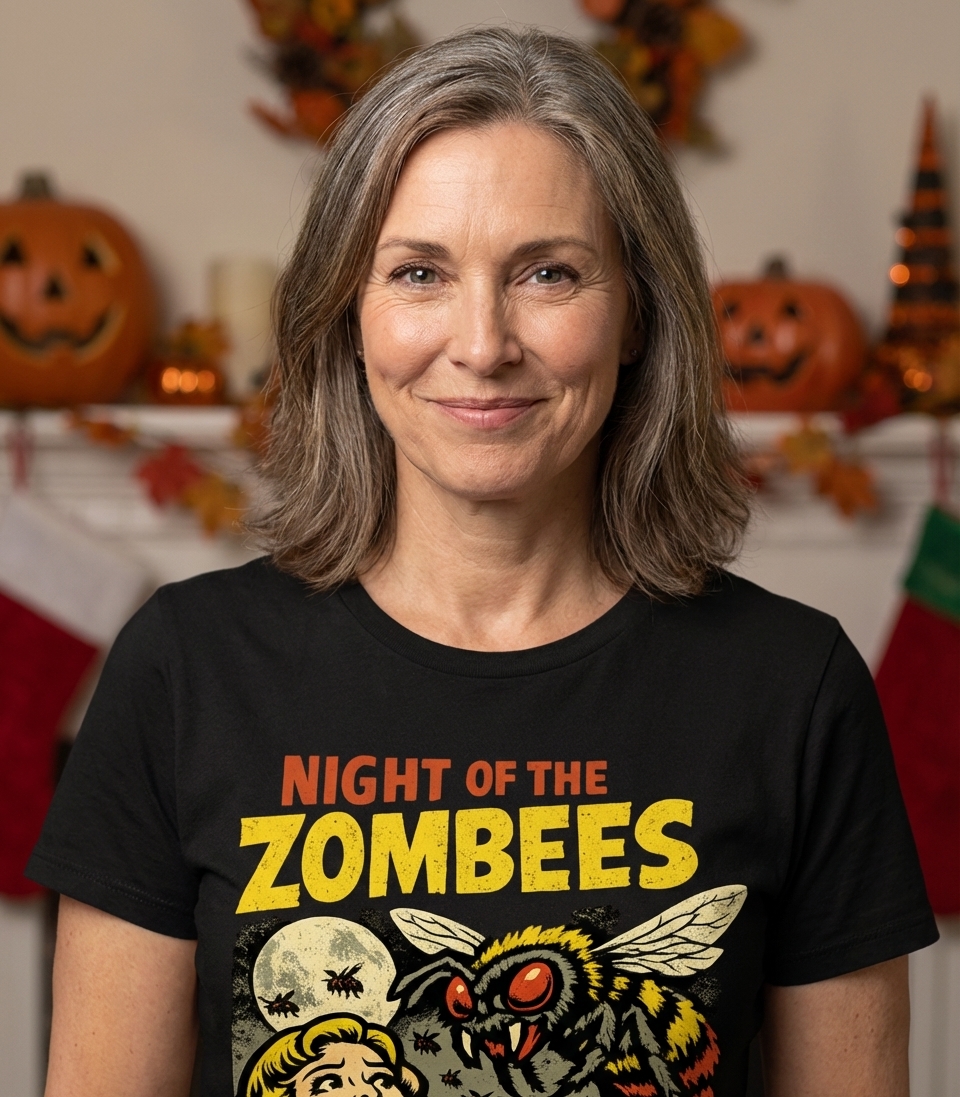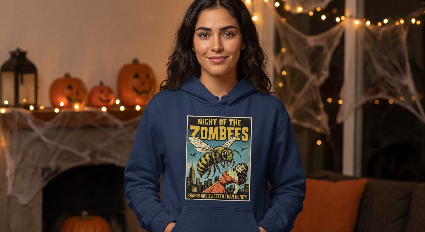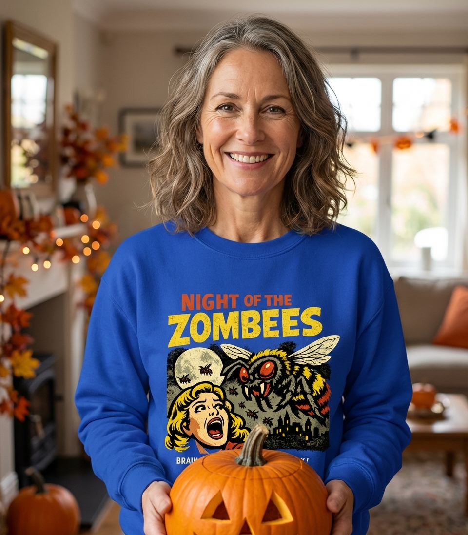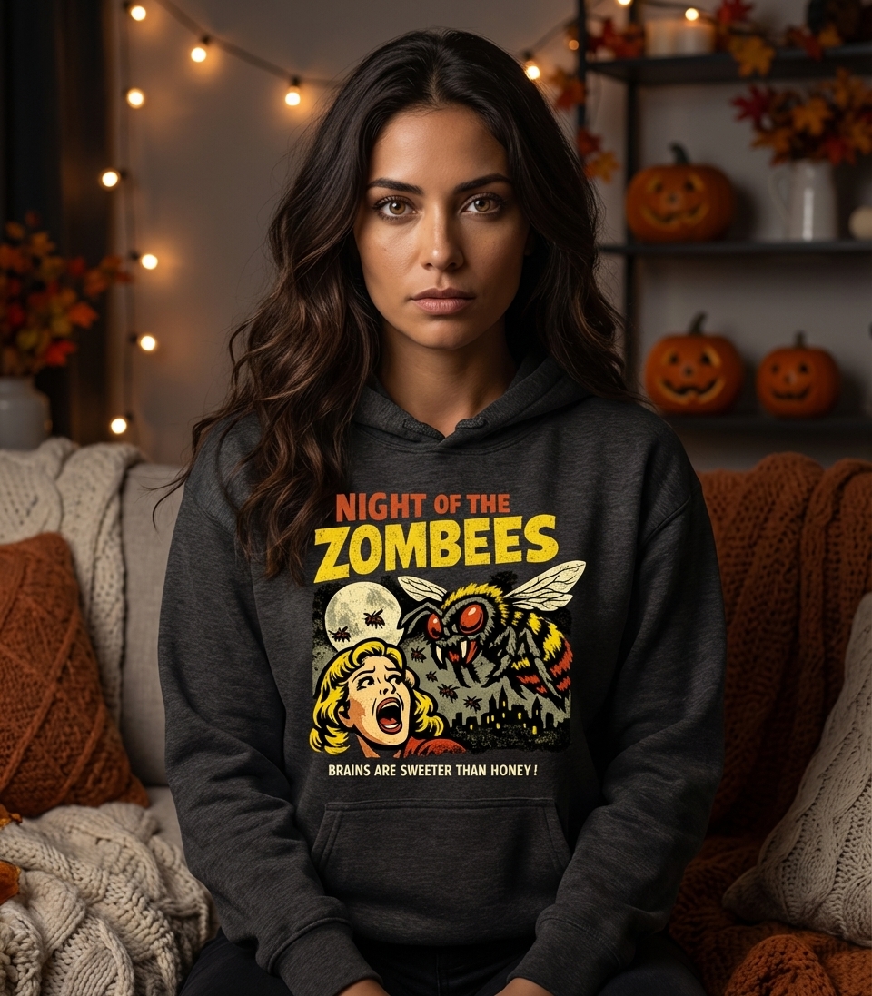 The "Night of the Zombees" phrase captures the lifestyle of horror movie enthusiasts who love retro B-movie aesthetics, witty monster puns, and spooky season fun.