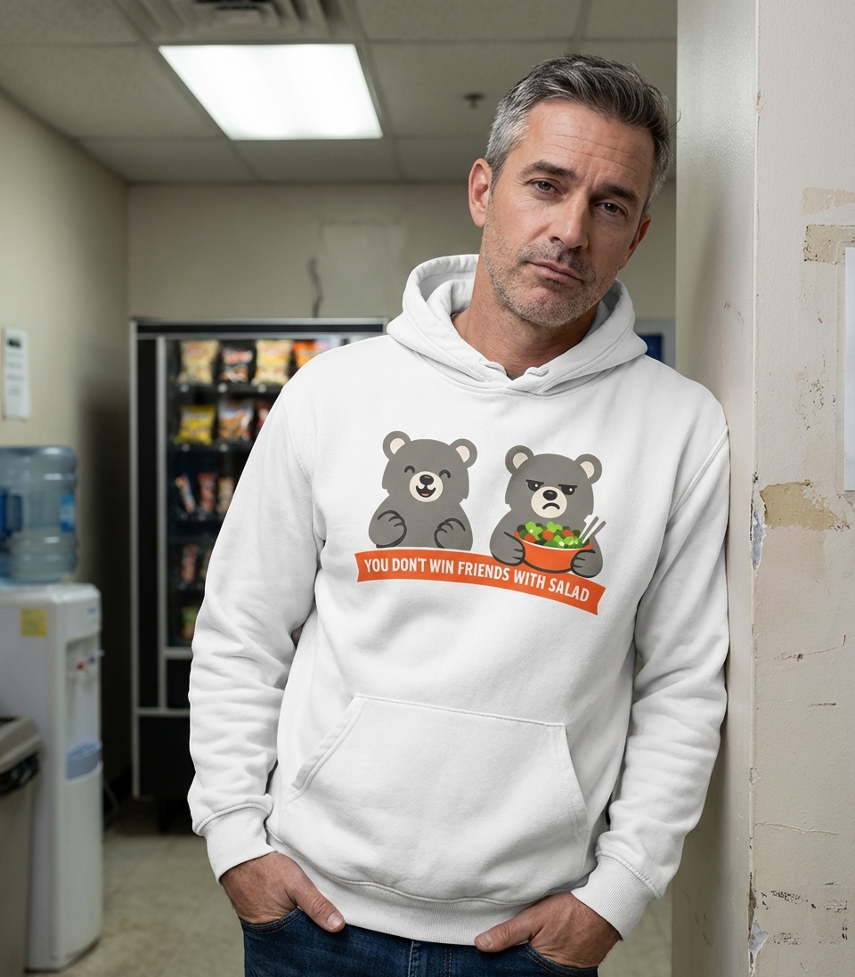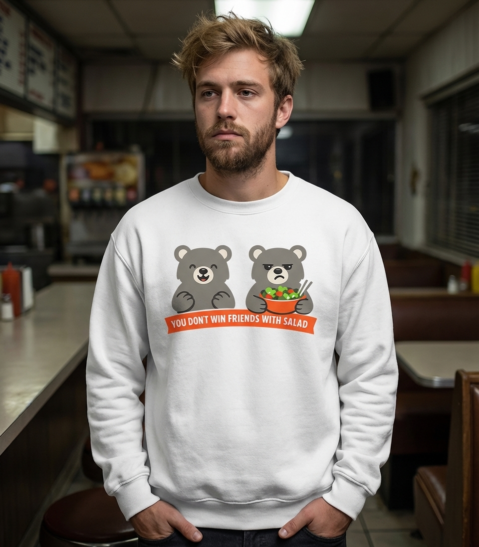 This design features two expressive cartoon bears, one happily content and the other comically grumpy while holding a bowl of salad. The artwork humorously contrasts the idea of healthy eating with the desire for more traditionally appealing, 'friend-winning' foods.