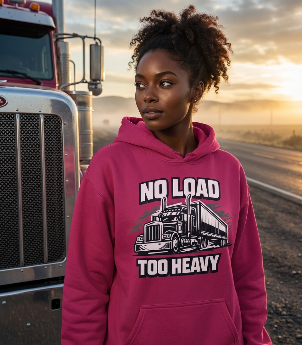 The 'No Load Too Heavy' phrase captures the lifestyle of dedicated truck drivers who spend their days hauling freight, navigating highways, and conquering challenging routes.