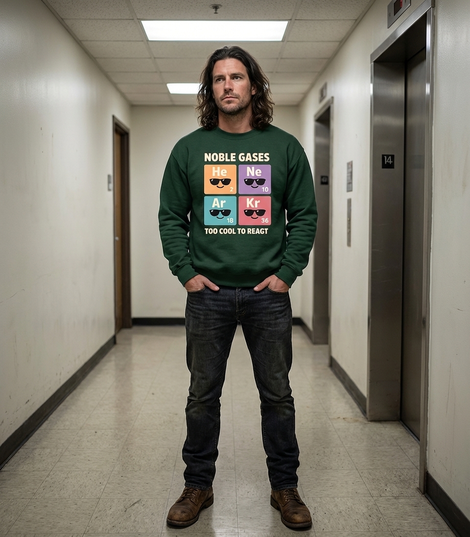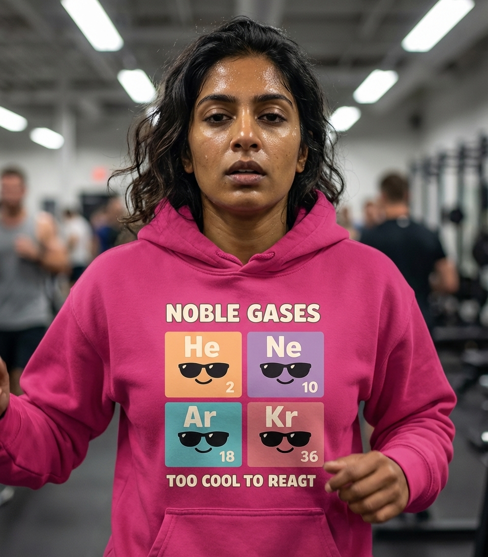 The design's core phrase, "NOBLE GASES TOO COOL TO REACT," is a clever chemistry pun. It highlights the inherent chemical inertness of noble gases, which means they are highly unreactive with other elements due to their stable electron configurations. The "too cool" phrasing playfully personifies their stability with an attitude of aloofness and superiority.