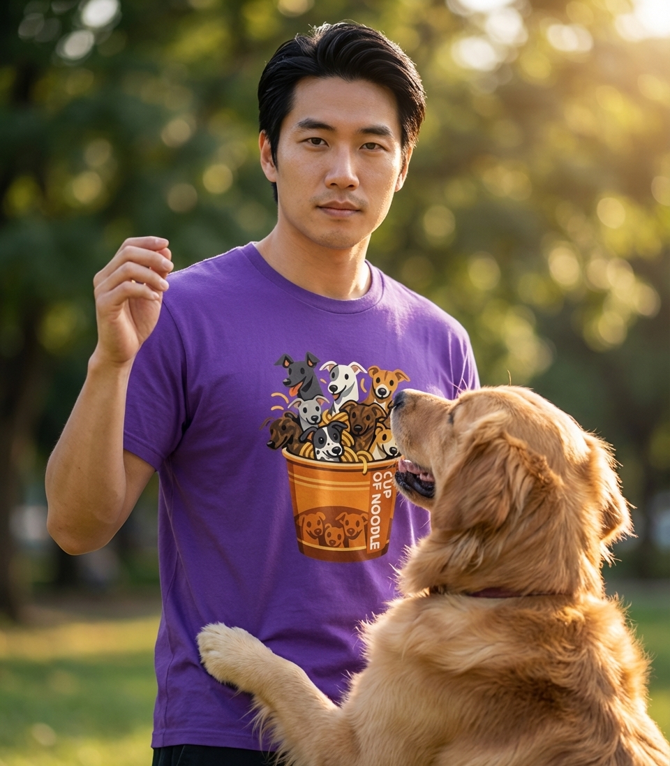 This whimsical graphic captures the quirky spirit of dog enthusiasts who adore their canine companions as much as a comforting bowl of ramen.
