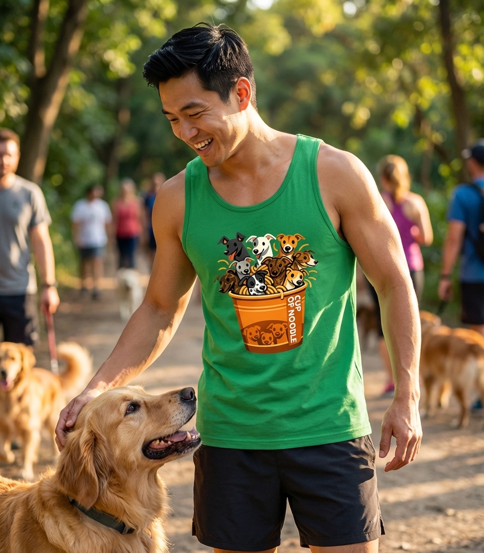 This charming design playfully reimagines the classic instant "Cup of Noodle" by filling it with a joyful assortment of happy, cartoon dogs. Each dog's head peeks out from a swirl of golden "noodles," creating a delightful and unexpected visual pun.