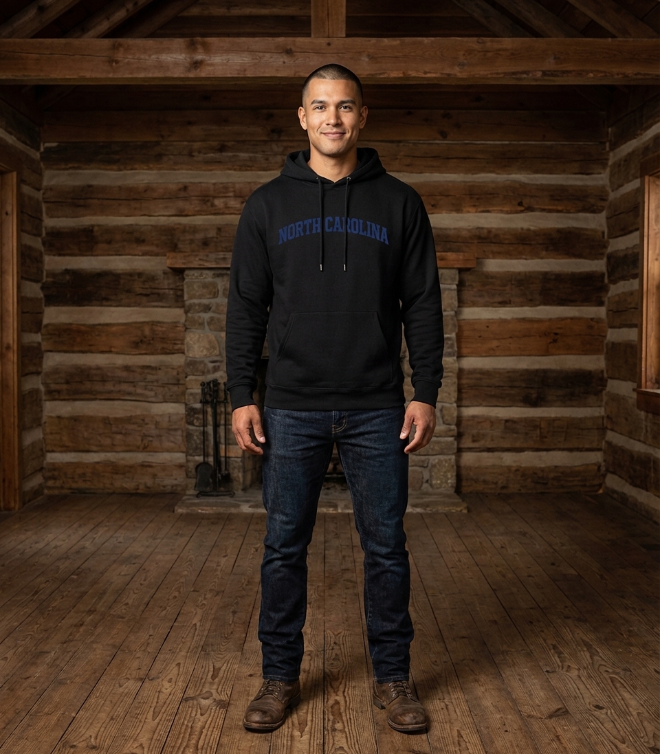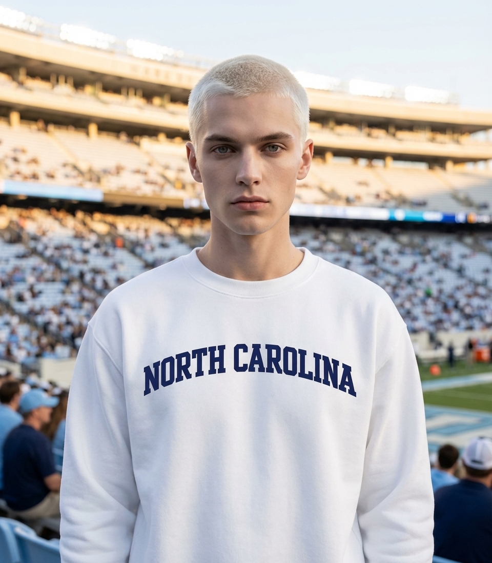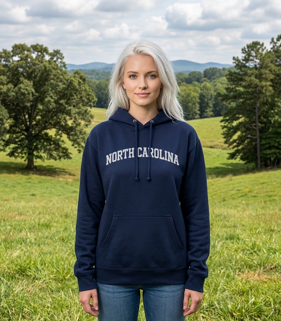This design prominently features the name 'North Carolina' in a classic, arched collegiate-style font. It offers a straightforward and timeless way to express state pride without complex graphics.