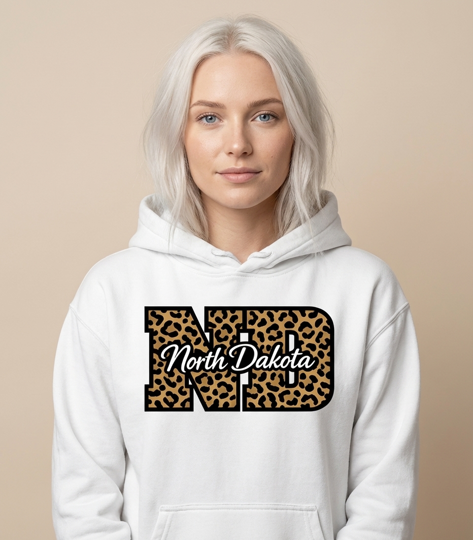 This design prominently features the abbreviation "ND" in a trendy leopard print pattern, symbolizing strength and style. Overlaid in a clean, elegant script is the full name "North Dakota," creating a sophisticated contrast.