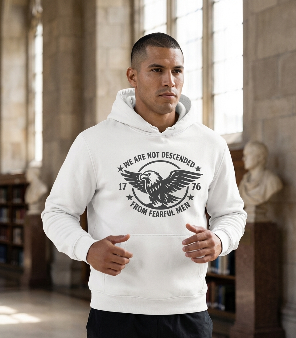 This powerful design features a bold American bald eagle, a symbol of freedom and strength, centered within a circular emblem. The artwork is framed by the defiant quote, "We Are Not Descended From Fearful Men," and the significant year "1776."