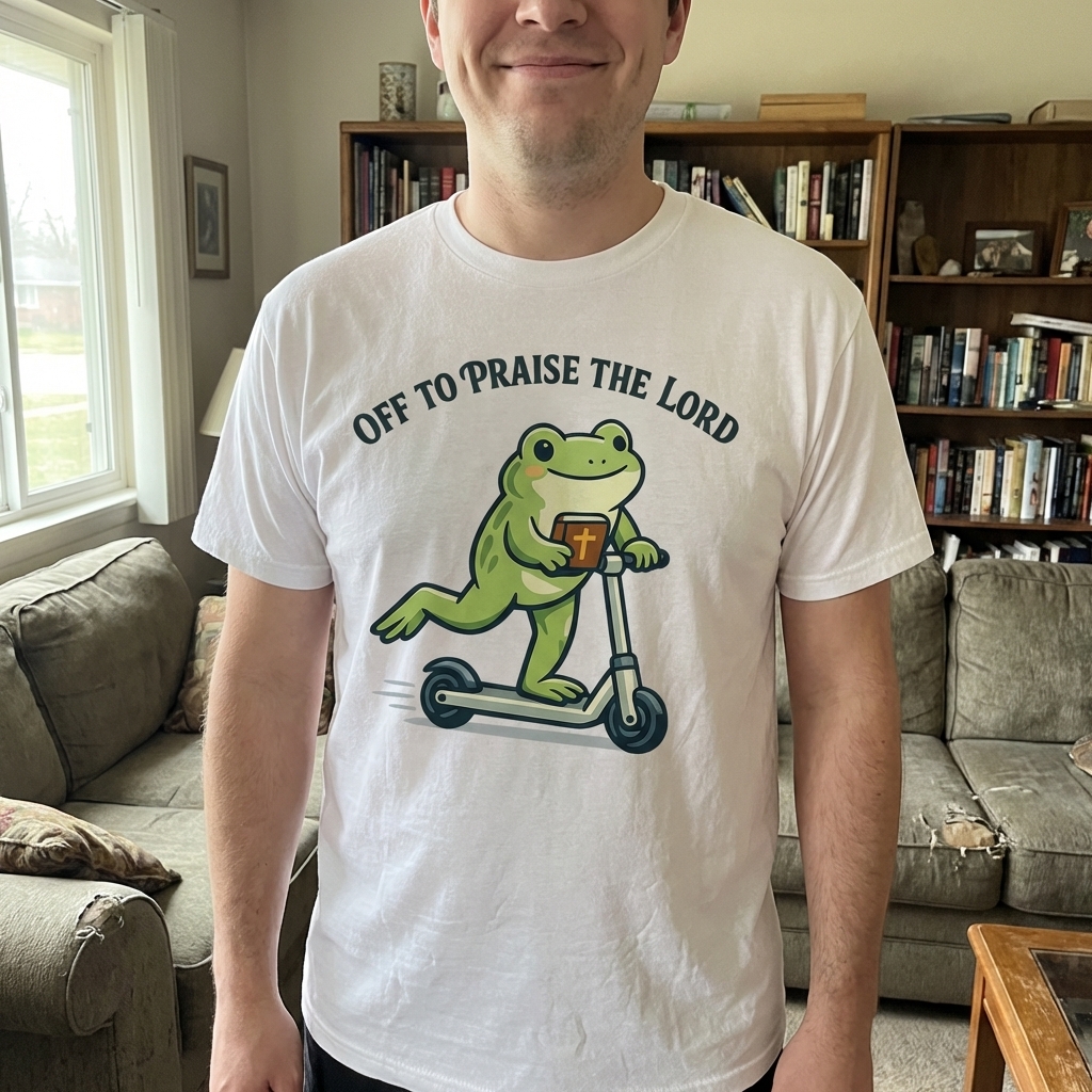 The 'Off To Praise The Lord' phrase captures the lifestyle of cheerful believers who start their day with spiritual enthusiasm, a smile, and a bit of playful adventure.