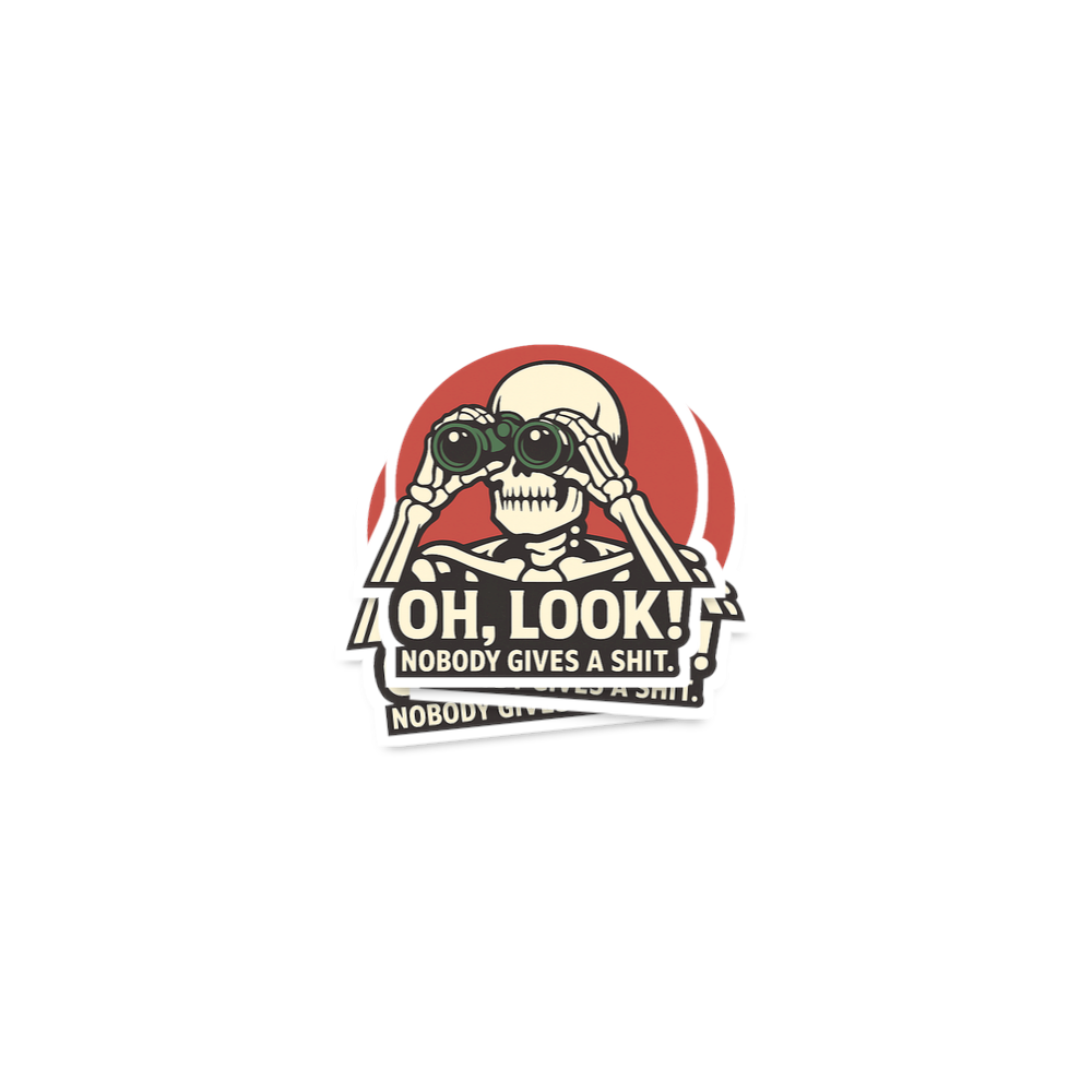 This graphic features a whimsical skeleton, complete with binoculars, set against a bold red circular backdrop. The clear, direct message combines a classic visual with a modern, unapologetic sentiment.