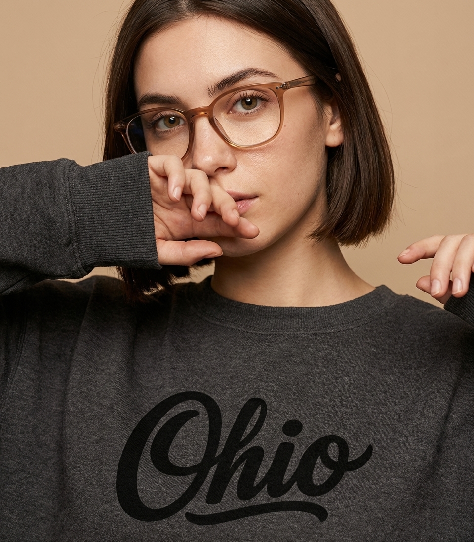 This minimalist design features the word 'Ohio' rendered in a sleek, classic script font. The outlined typography creates a sophisticated look, making it a versatile piece for any wardrobe.