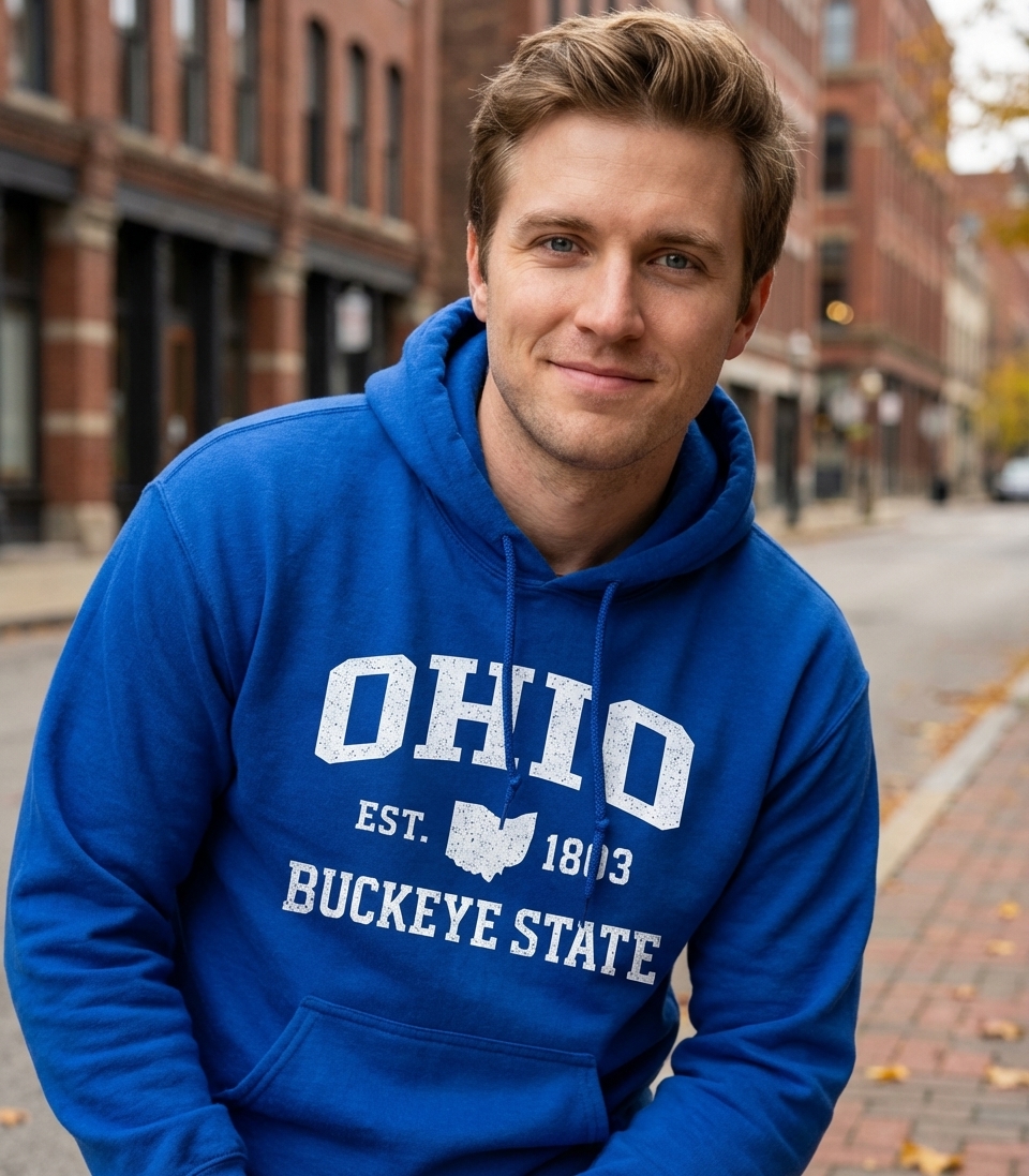 Elevate your Graphic collection with Ohio Slogan Basic T-Shirt on a Hooded Sweatshirt! Generated via Design Mixer.