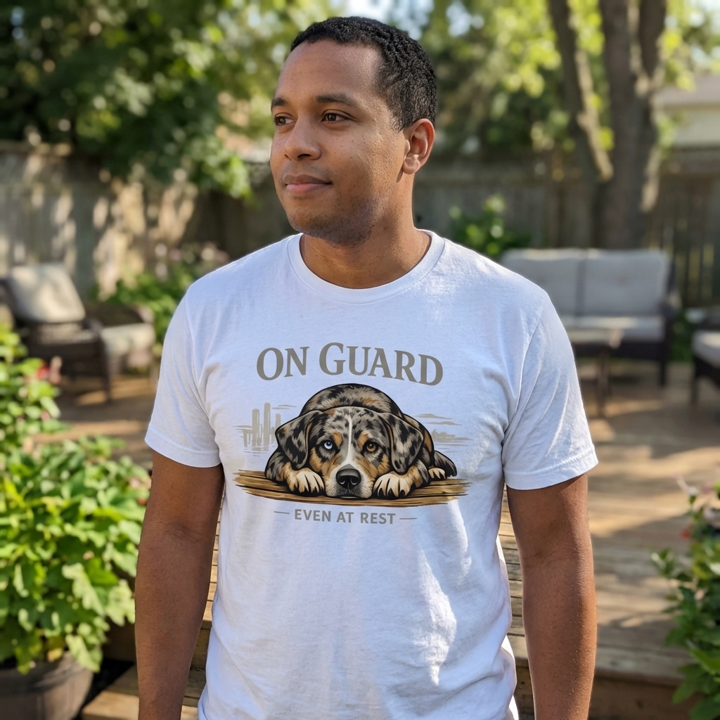 This artwork features a beautifully illustrated dog, possibly an Australian Shepherd, with a distinctive merle coat and heterochromia, showcasing one blue and one brown eye. The dog is depicted in a relaxed, resting posture with its paws crossed, yet its eyes convey an alert and watchful demeanor. The phrase 'ON GUARD EVEN AT REST' encapsulates the essence of a loyal and protective canine companion.