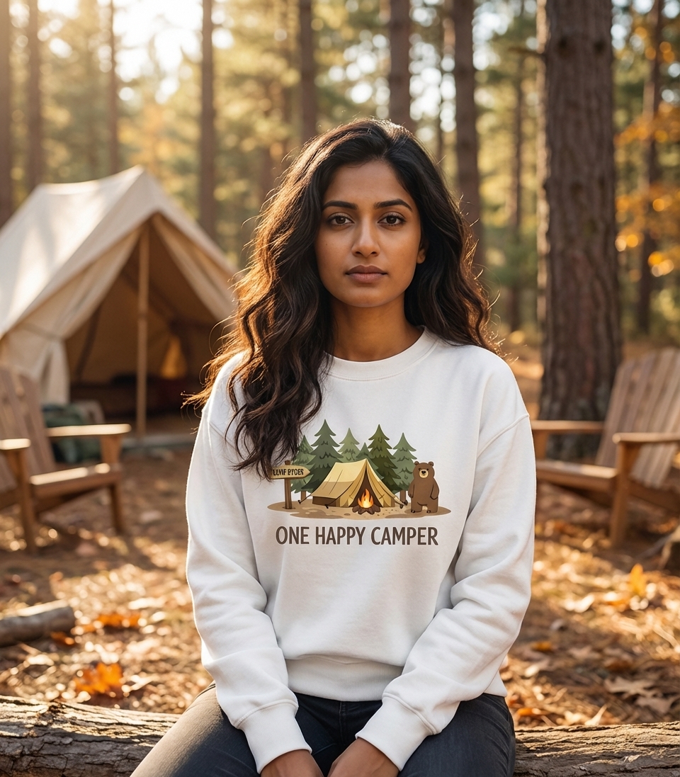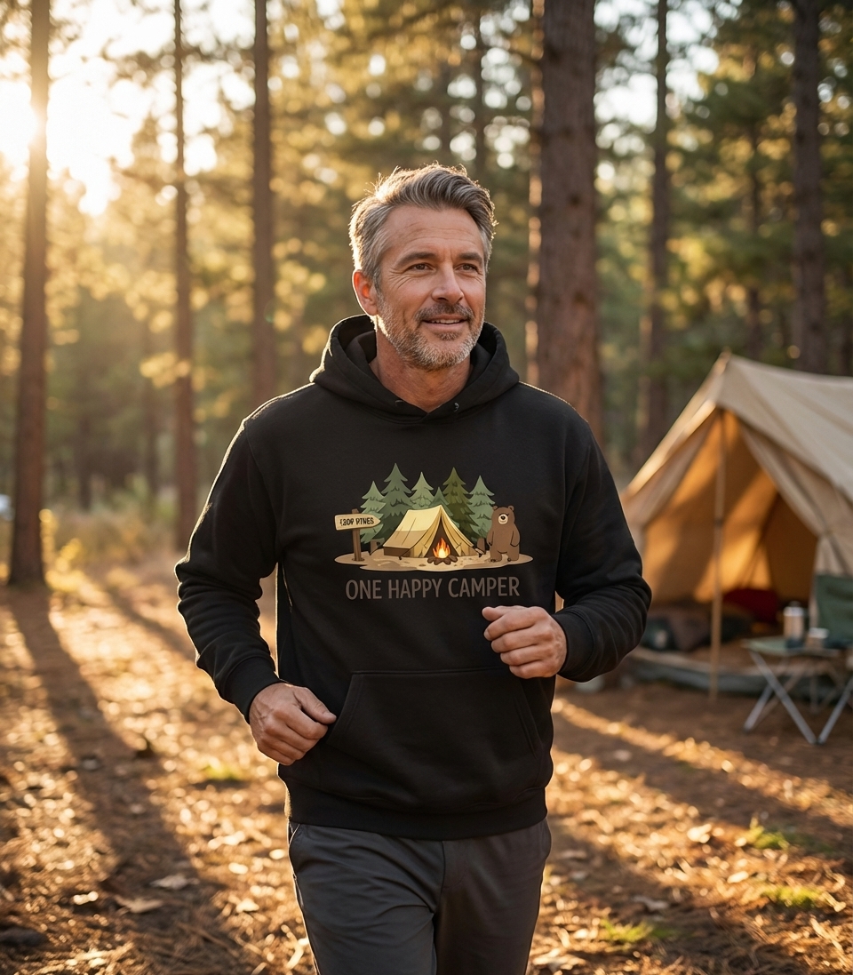 The "One Happy Camper" phrase captures the lifestyle of passionate outdoor enthusiasts who spend their days exploring trails, setting up tents, and enjoying campfires.