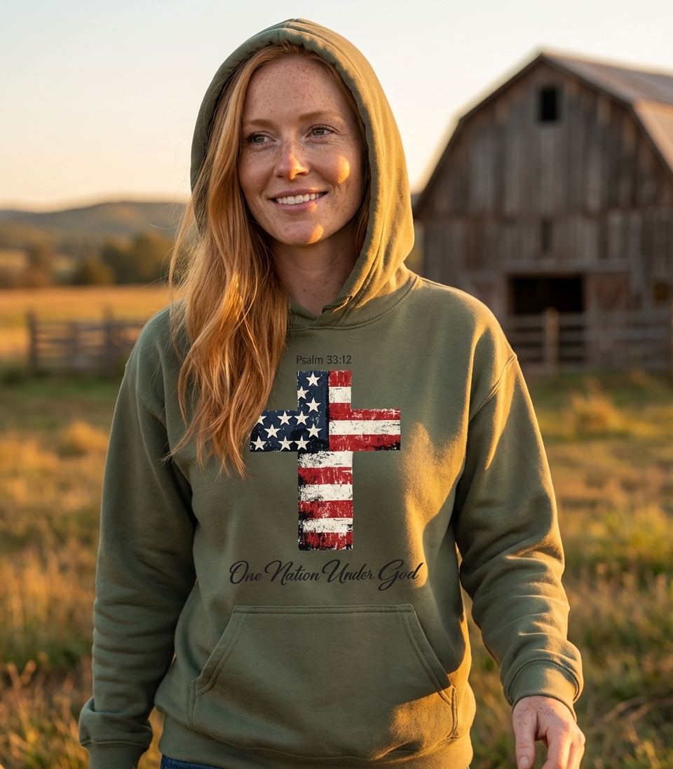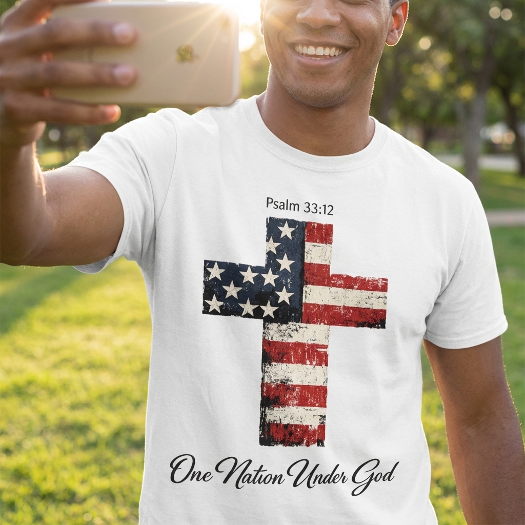 The 'One Nation Under God' phrase captures the lifestyle of patriotic Americans who express their Christian faith, celebrate national identity, and honor foundational values.