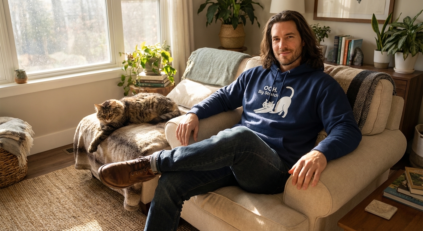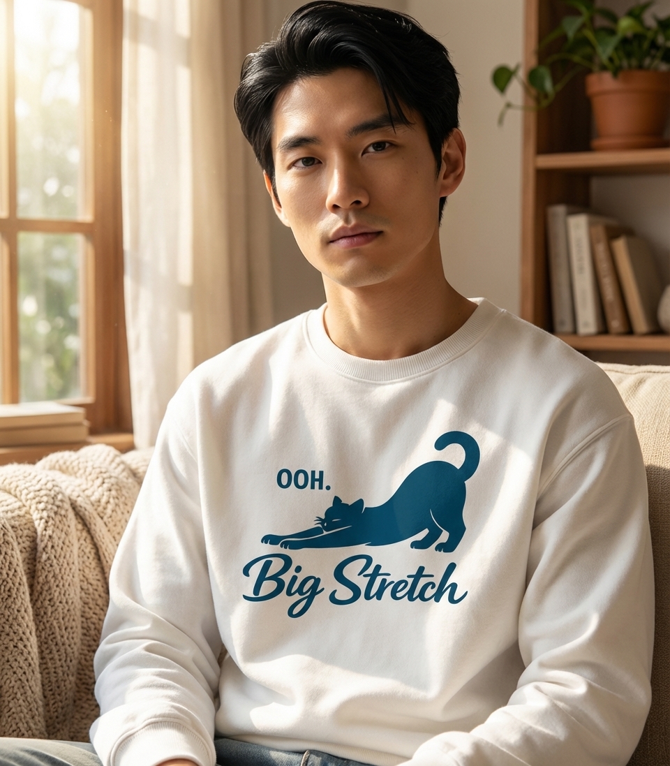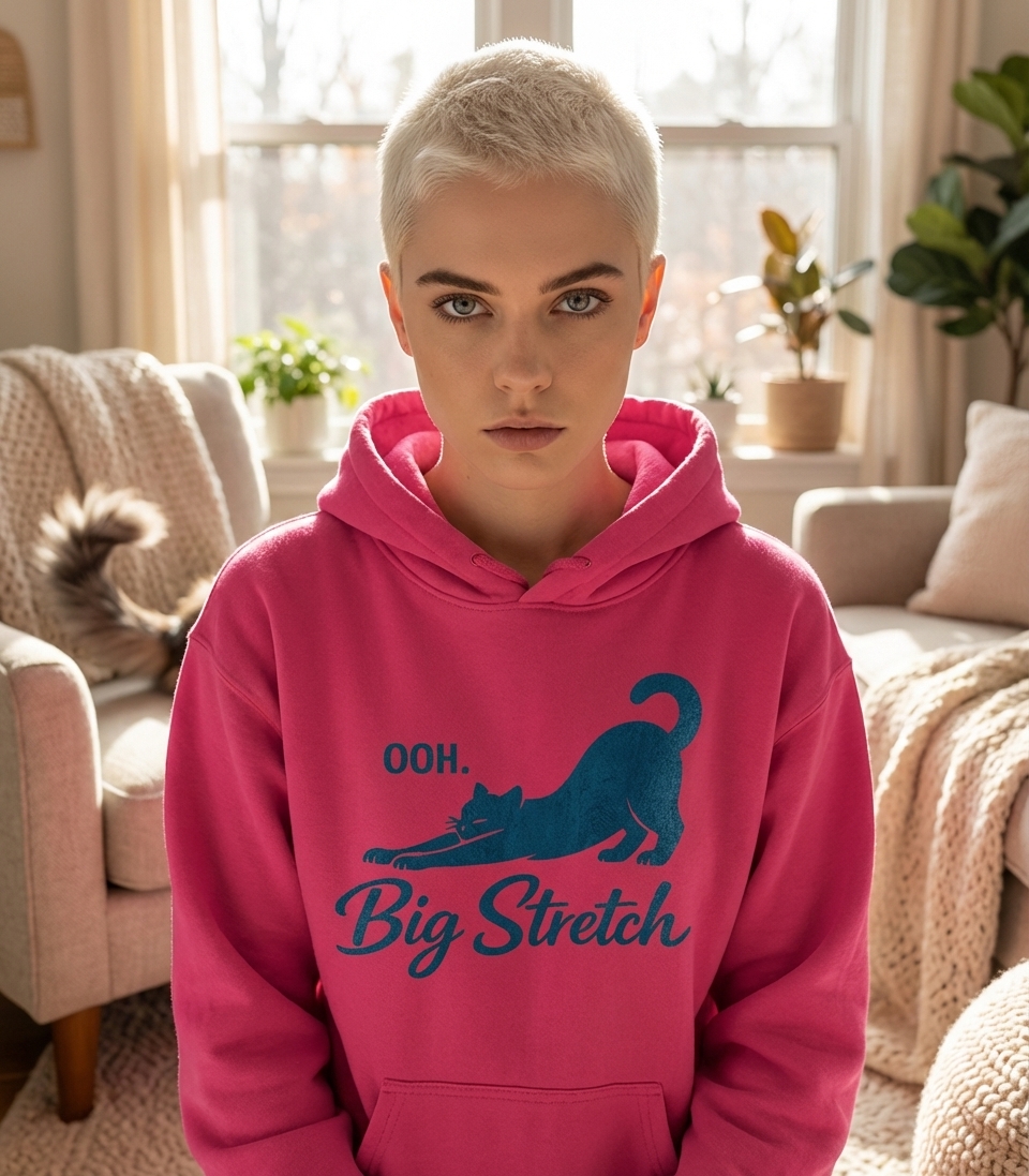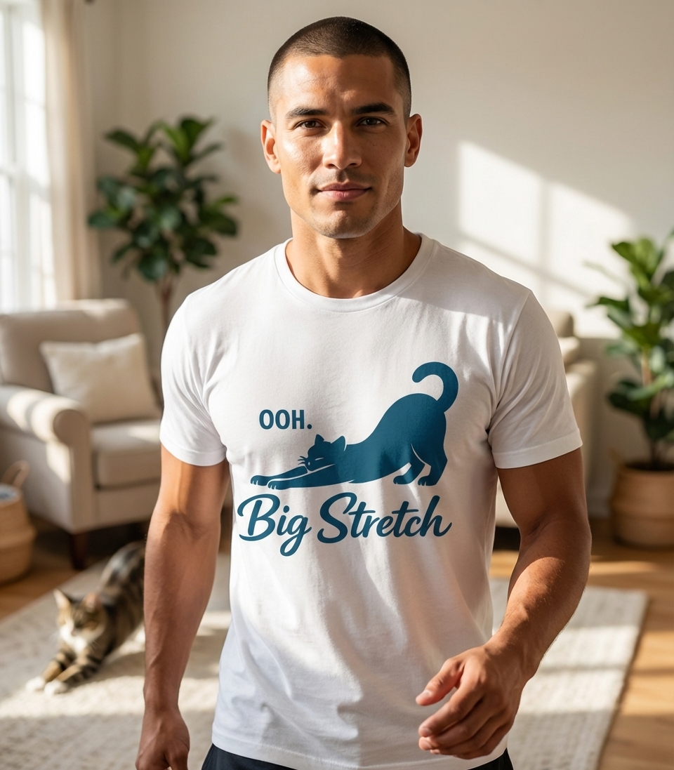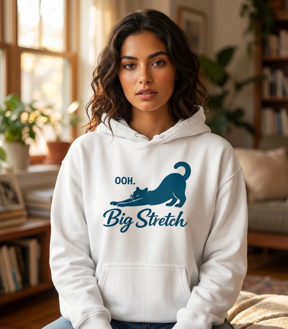 The 'OOH. Big Stretch' phrase captures the lifestyle of devoted cat enthusiasts who enjoy quiet moments, cozy comforts, and appreciating their feline friends.