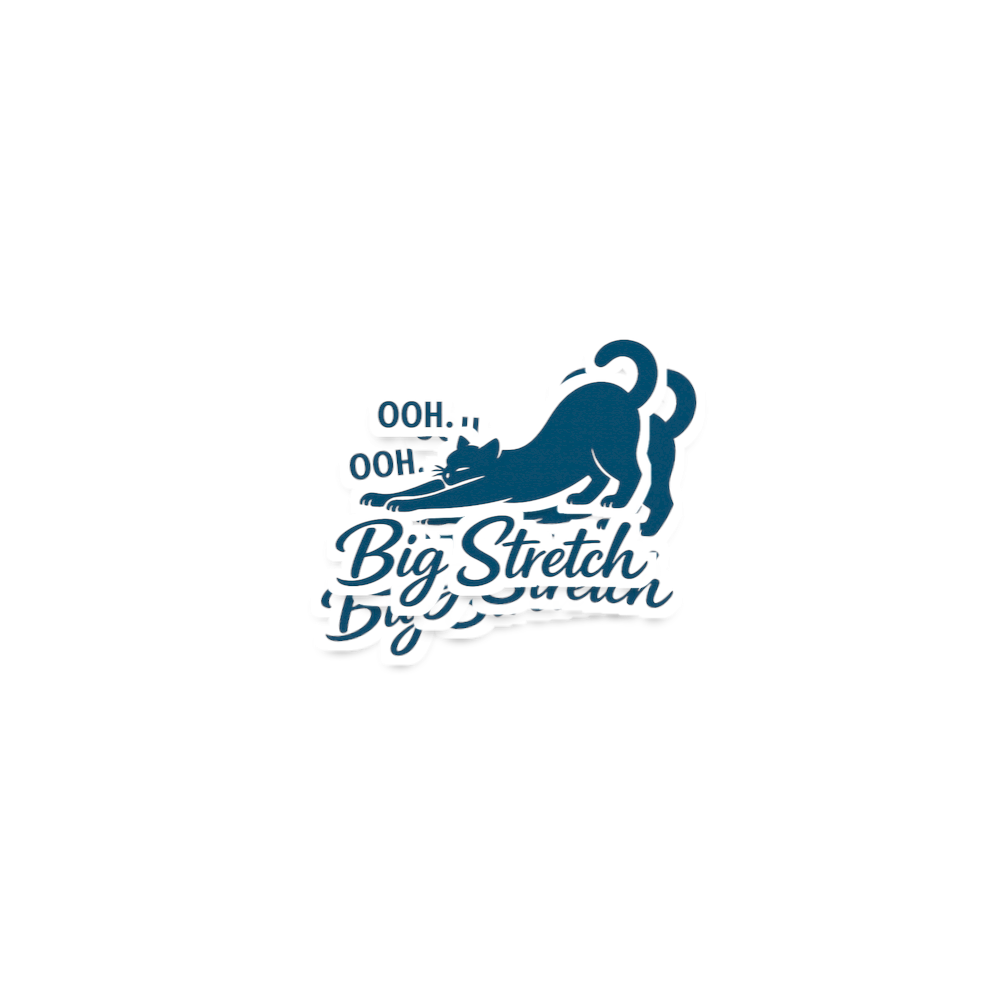 This artwork features a charming, stylized illustration of a cat mid-stretch, accompanied by the relatable phrase "OOH. Big Stretch". The design captures a common and endearing feline behavior, evoking feelings of relaxation and comfort.