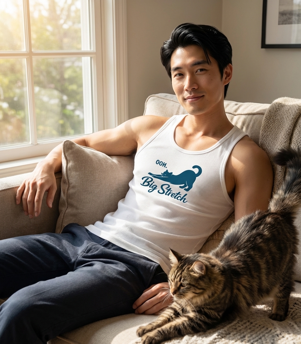 "OOH. Big Stretch" is a humorous and affectionate commentary on the universal experience of a cat waking up or settling down with a dramatic, full-body stretch. It resonates with anyone who understands the simple pleasures of feline life and the often-comical routines of their pets.