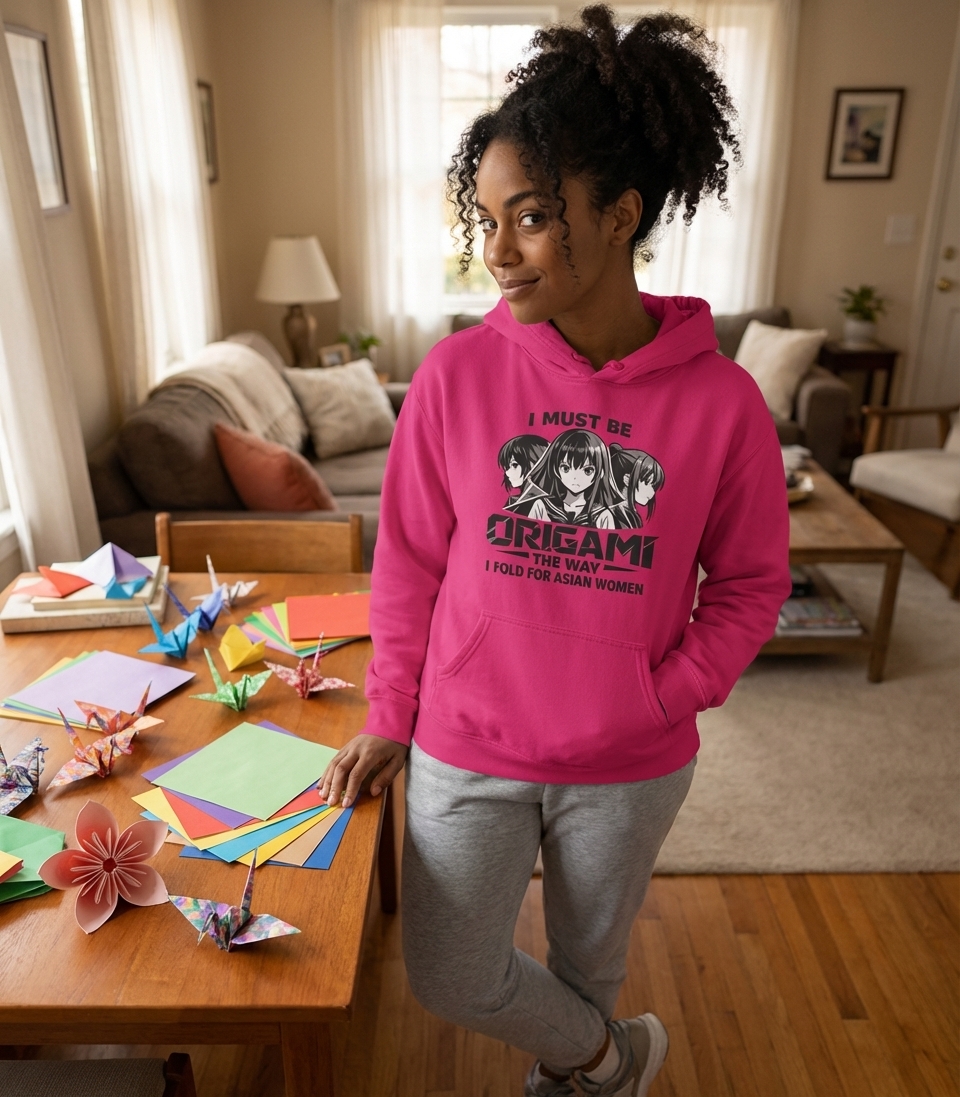 The phrase 'I MUST BE ORIGAMI THE WAY I FOLD FOR ASIAN WOMEN' is a humorous pun. It uses the concept of folding, associated with origami, to imply being easily swayed or charmed ("folding") in admiration for Asian women, common in certain online communities and dating humor.