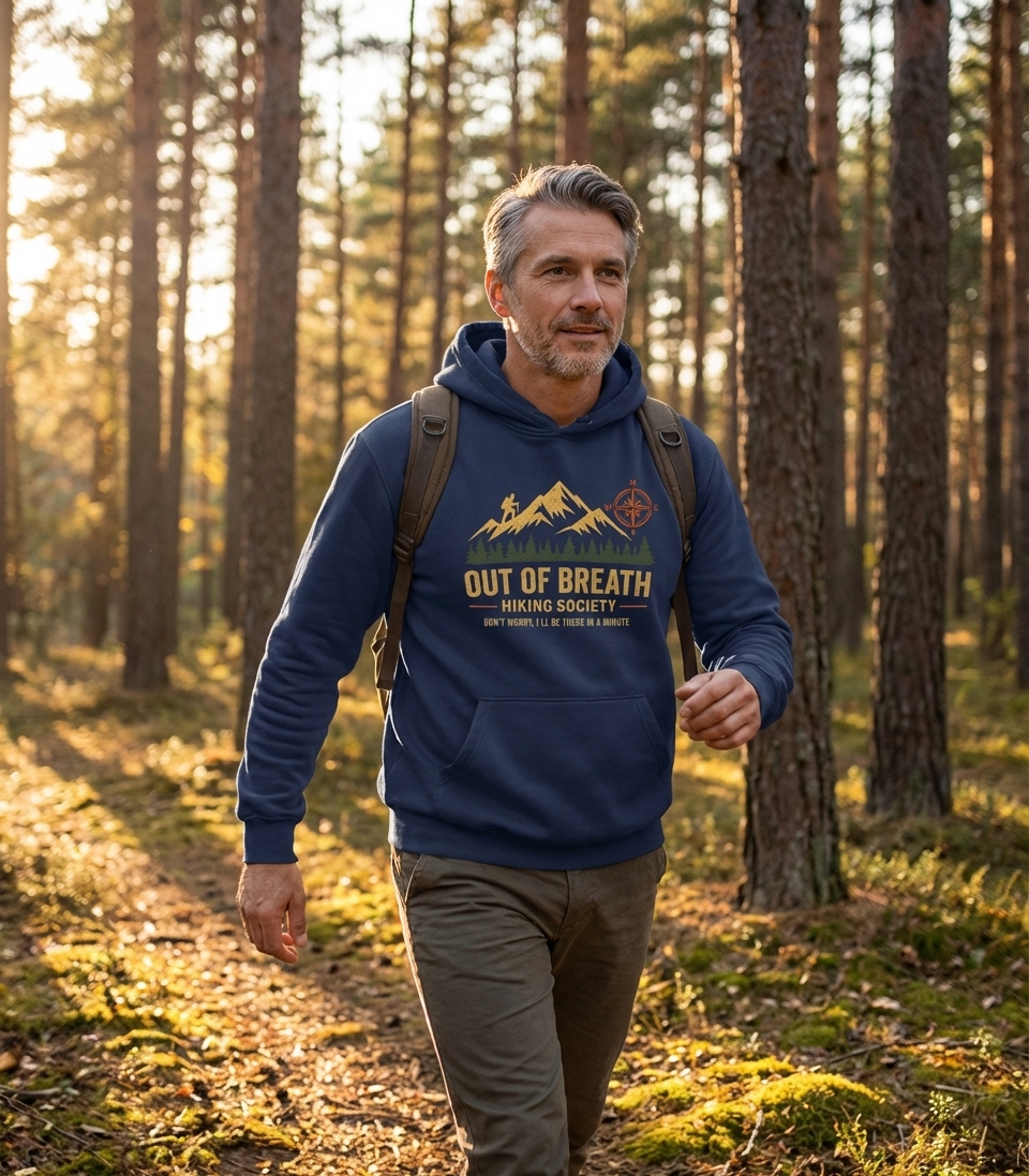 This design captures the relatable experience and camaraderie of hikers who embrace every challenge, even when it leaves them winded.