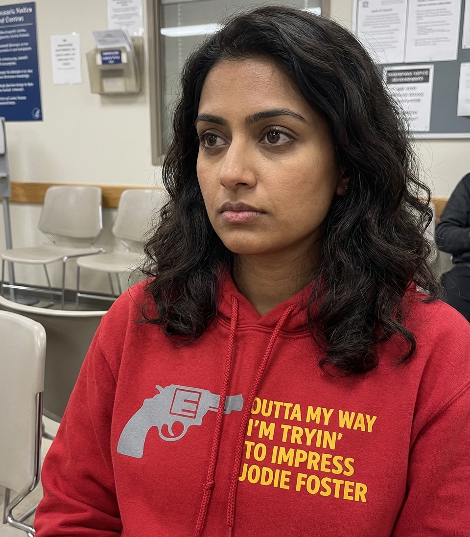 The phrase "OUTTA MY WAY I'M TRYIN' TO IMPRESS JODIE FOSTER" is a direct and widely recognized reference to John Hinckley Jr.'s motive for his attempted assassination of President Ronald Reagan in 1981. This statement is infamous for its connection to a tragic and violent historical event.