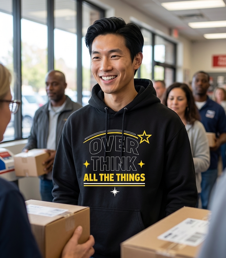 This design humorously highlights the common tendency to overthink every aspect of life. Featuring bold typography with contrasting white and yellow elements on a black background, it delivers a clear, self-aware message.