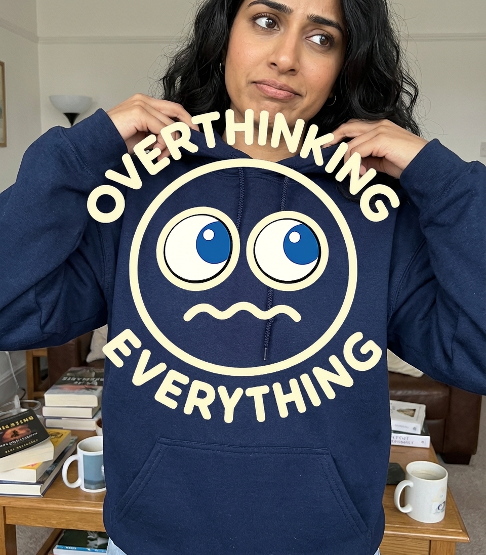 The phrase "Overthinking Everything" resonates deeply with a wide audience who often find themselves caught in cycles of excessive analysis and worry. It captures the humorous and sometimes frustrating reality of having a mind that constantly processes and re-processes thoughts.