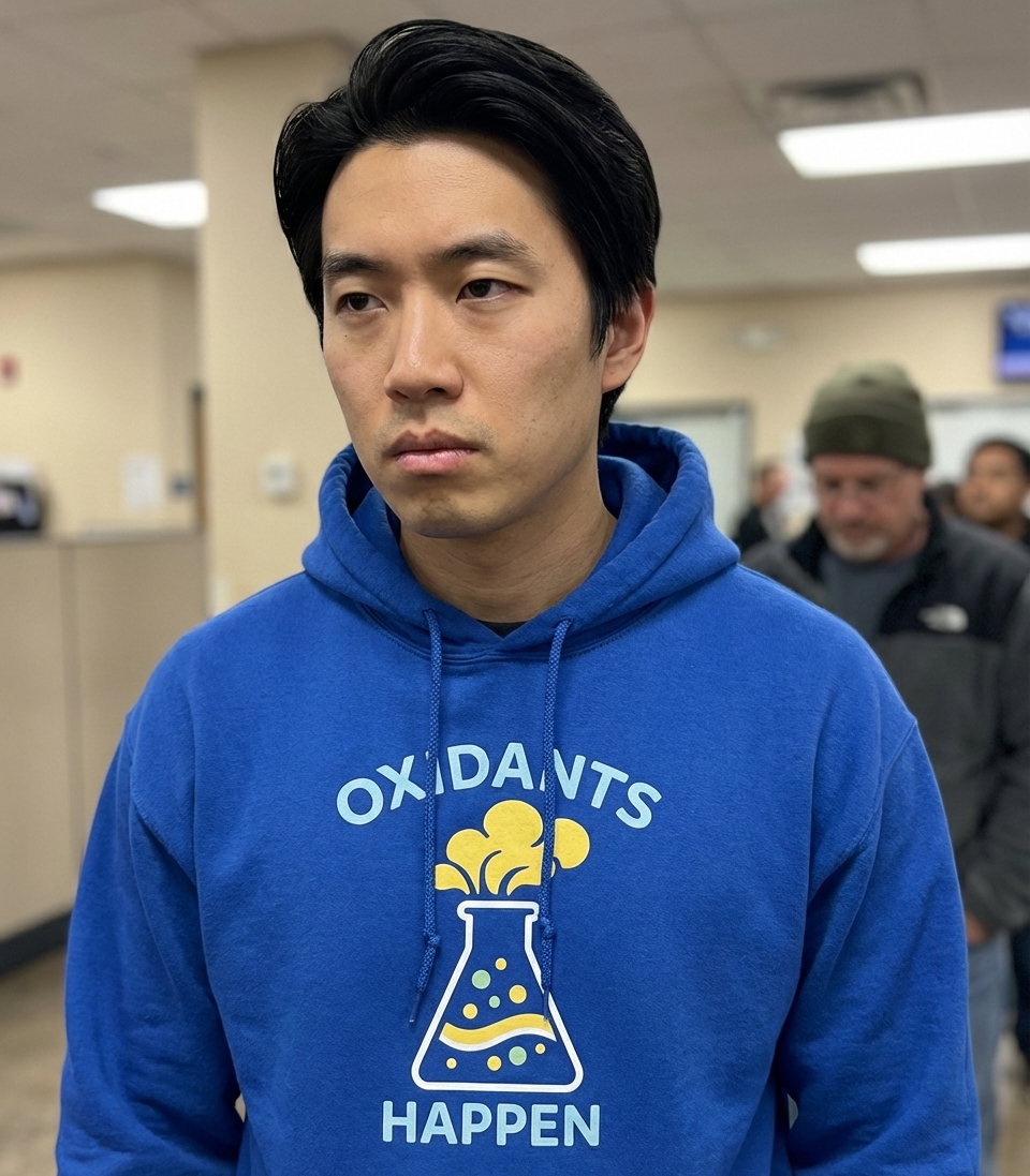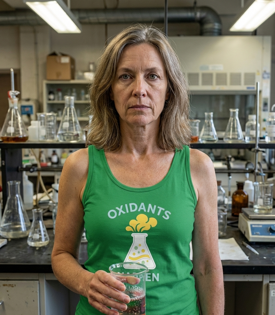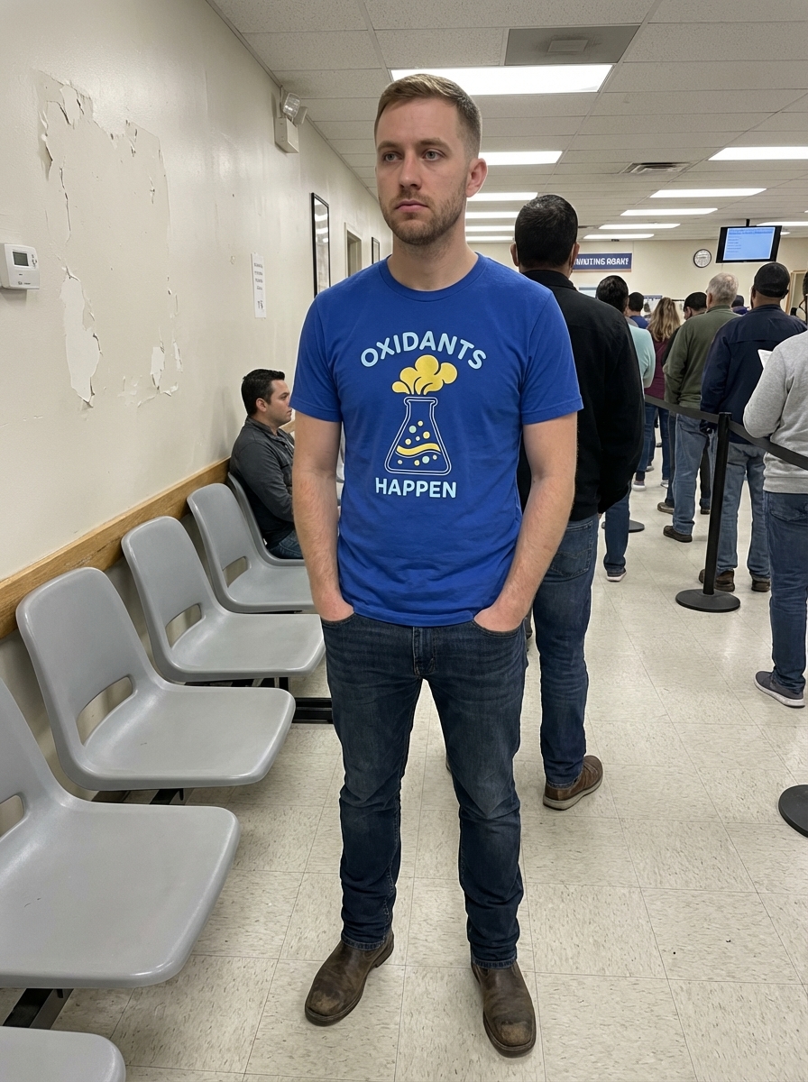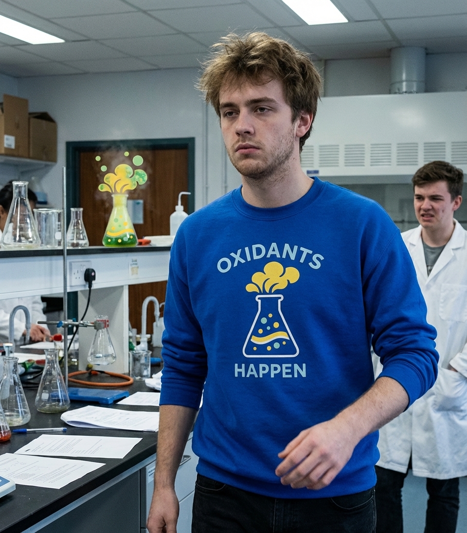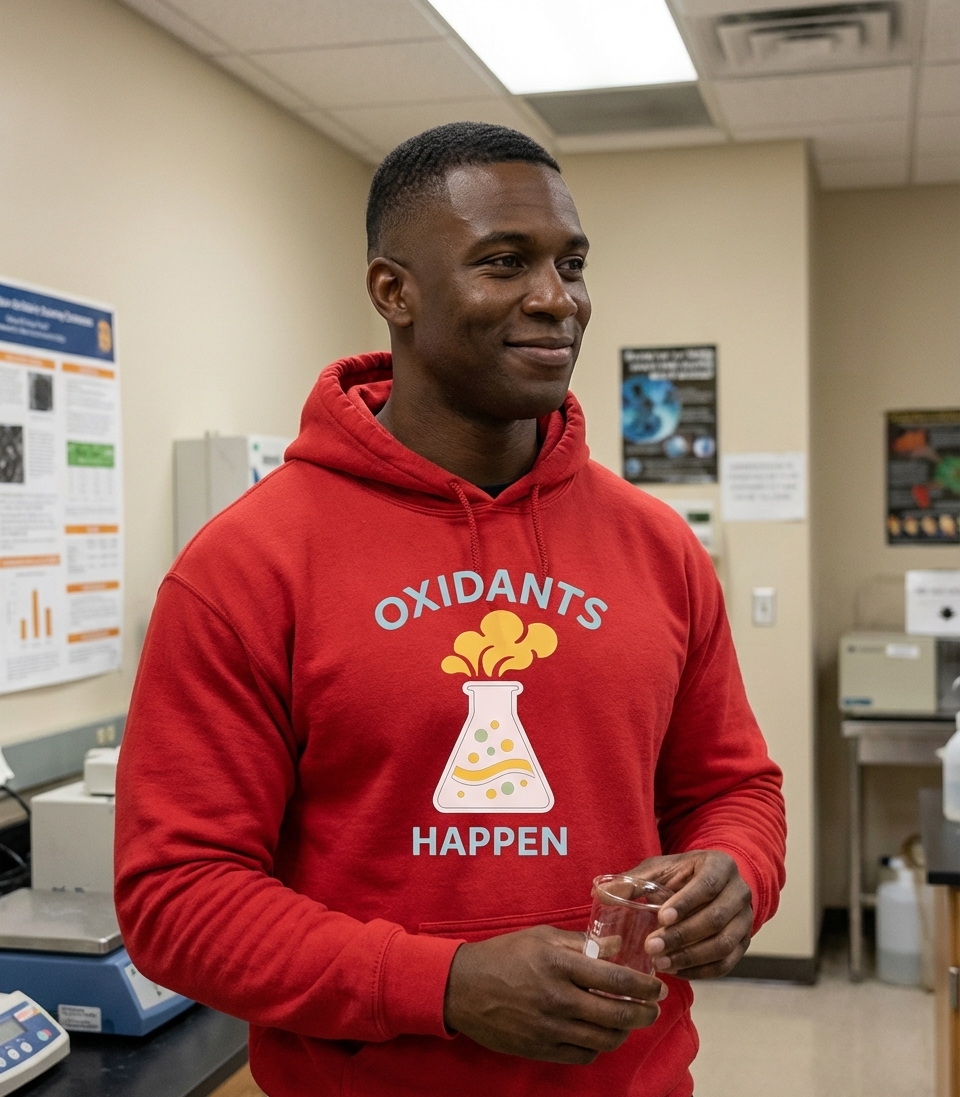The 'Oxidants Happen' phrase captures the lifestyle of science enthusiasts who appreciate witty chemistry puns, lab humor, and the fundamental processes of life.