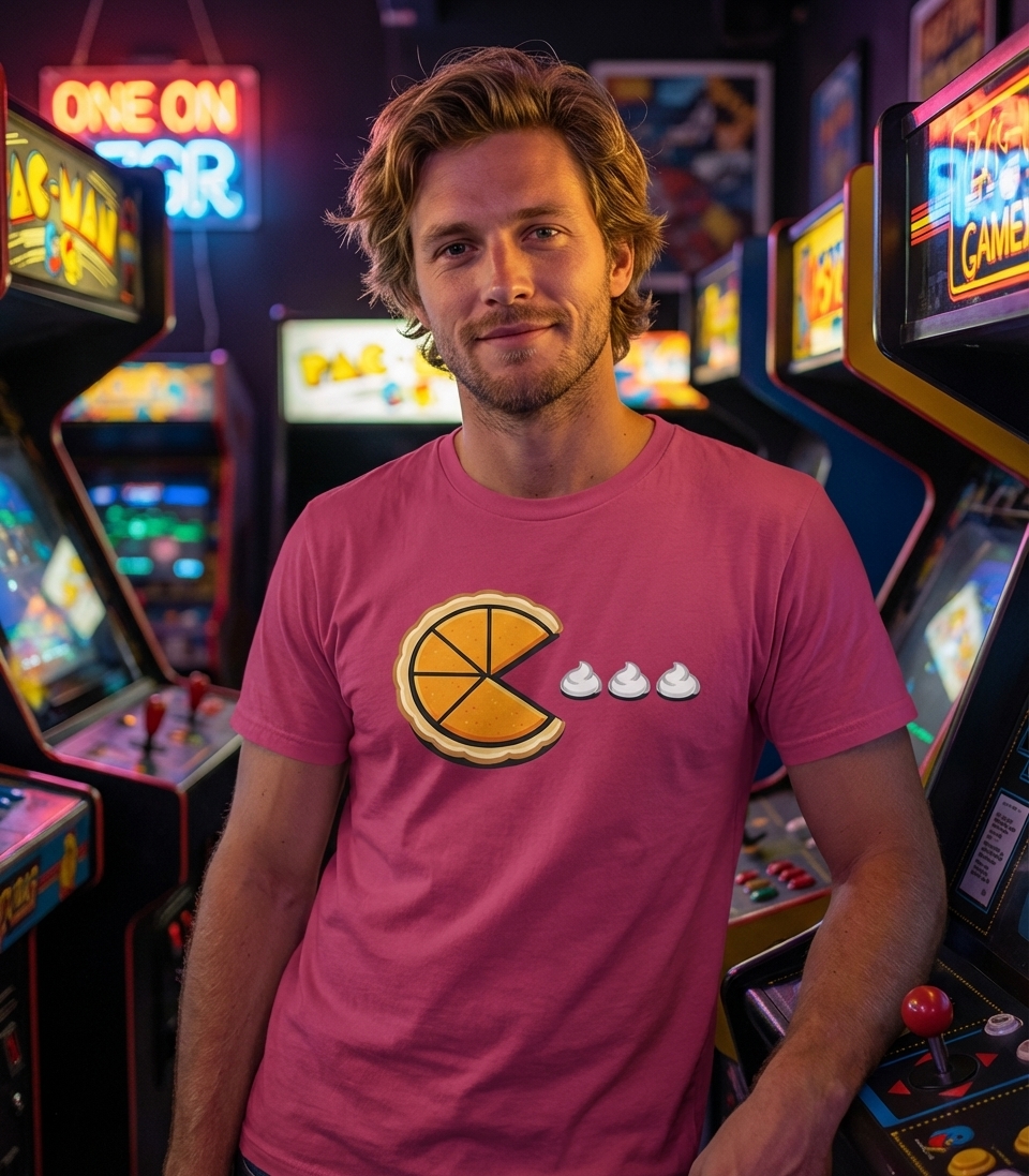 The Pac-Man Pie design captures the playful spirit of retro gamers who enjoy classic arcade aesthetics, delicious desserts, and humorous visual puns.