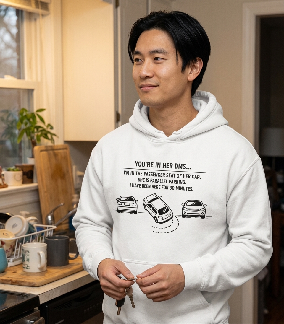 The "You're in her DMs, I'm in the passenger seat" phrase captures the relatable frustration of someone waiting patiently while their companion struggles with the seemingly endless task of parallel parking.
