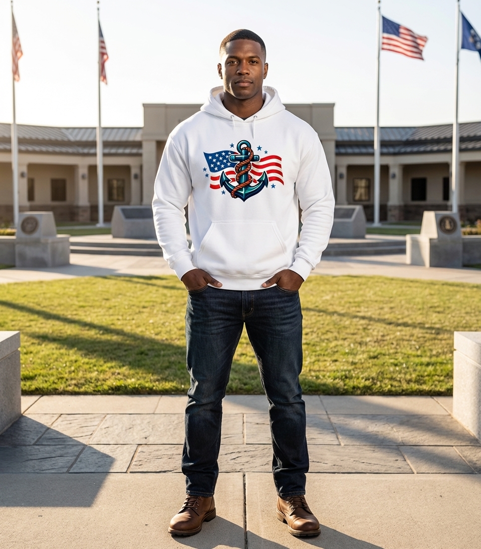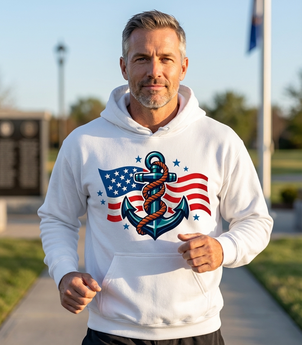 This patriotic design with an anchor and American flag captures the spirit of those who honor service, freedom, and the nation's maritime heritage.