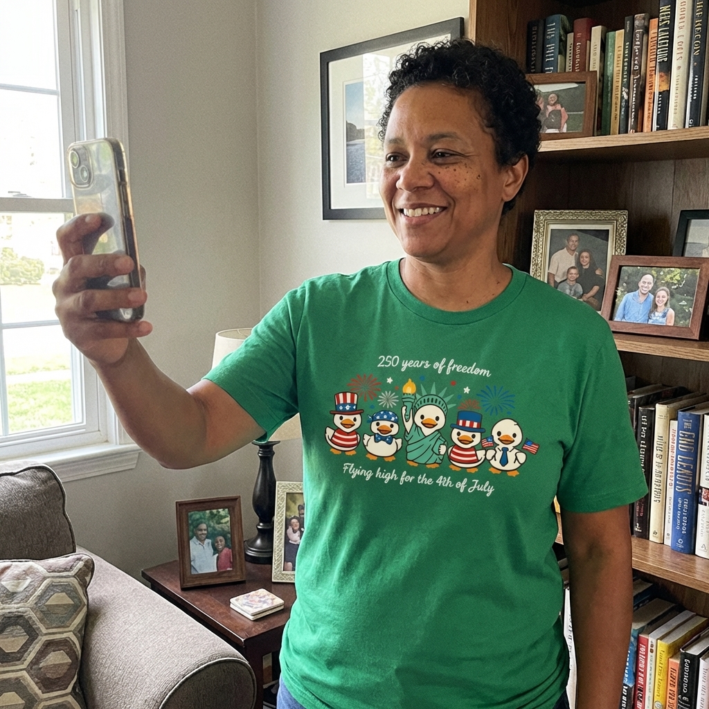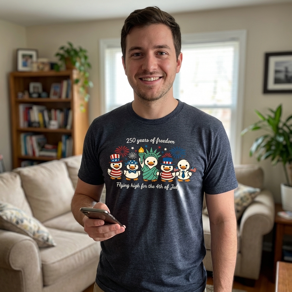 This charming t-shirt design features a parade of adorable cartoon ducks, each embodying a different aspect of American patriotism. From a duck dressed as the Statue of Liberty to others sporting Uncle Sam hats and holding American flags, the artwork captures a playful yet heartfelt celebration of the nation's independence.