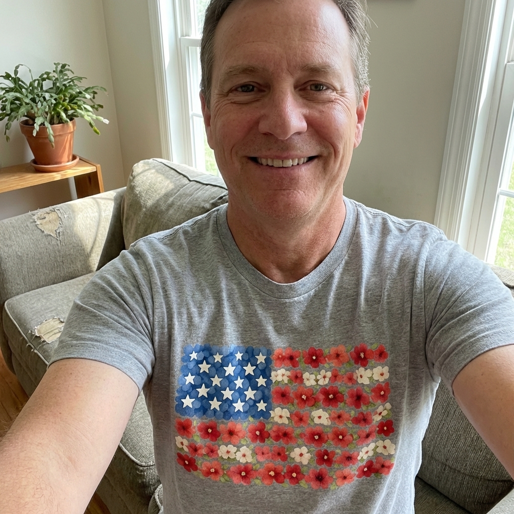 really happy with this shirt! the patriotic floral design is so cool, it's subtle but still makes a statement. plus, it's super comfy and fits perfectly.