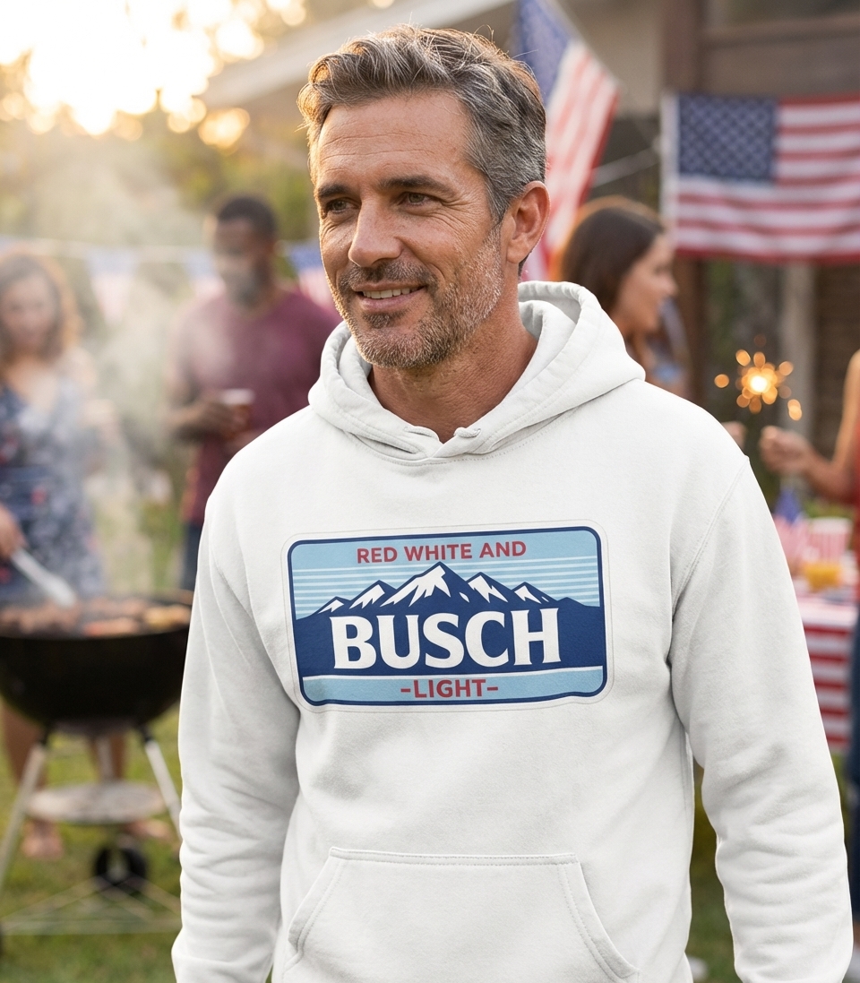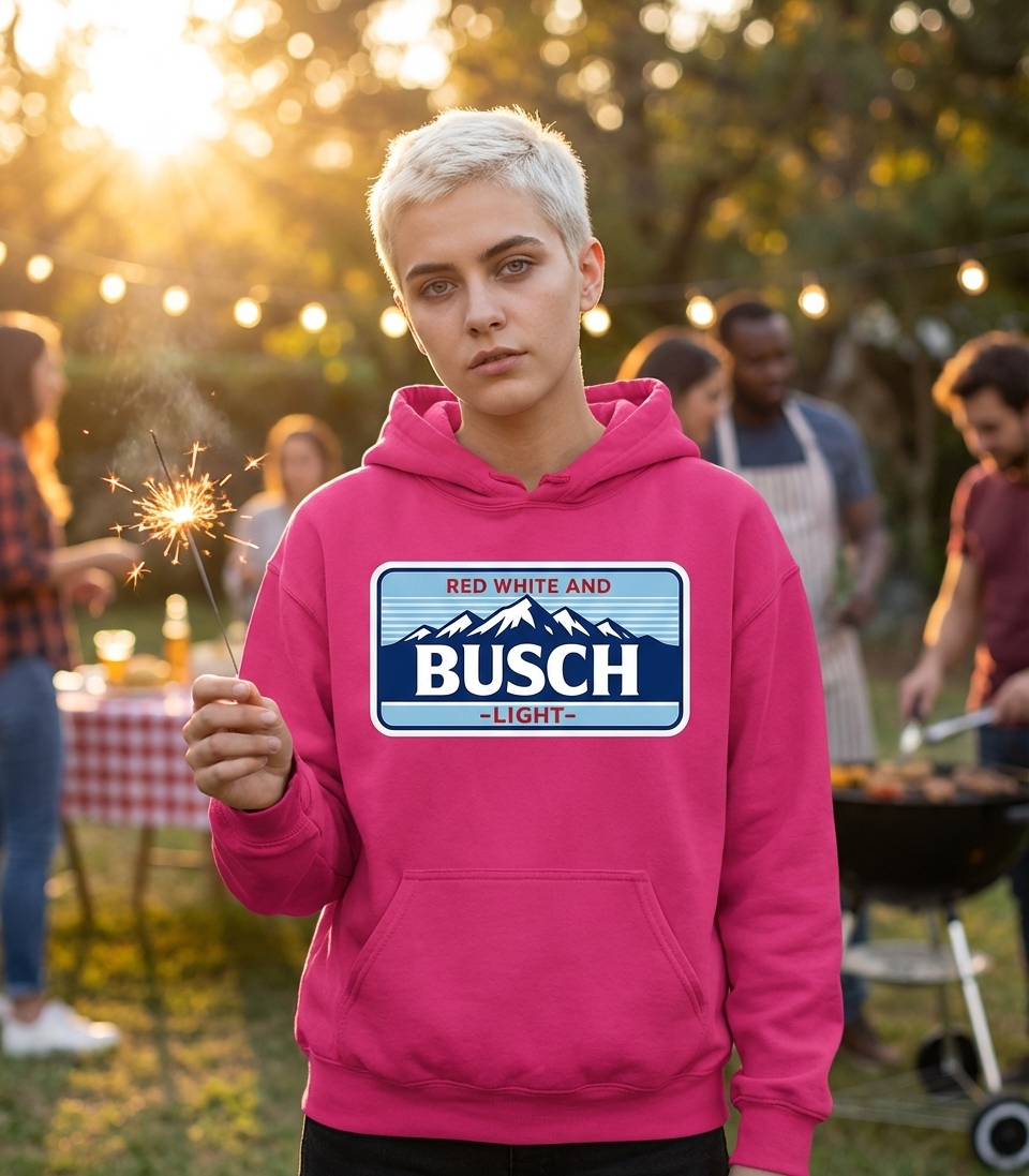 The phrase "Red White and Busch Light" is a playful take on the patriotic "Red, White, and Blue," directly referencing a popular light beer. It symbolizes a relaxed, all-American spirit often associated with holidays and casual get-togethers.