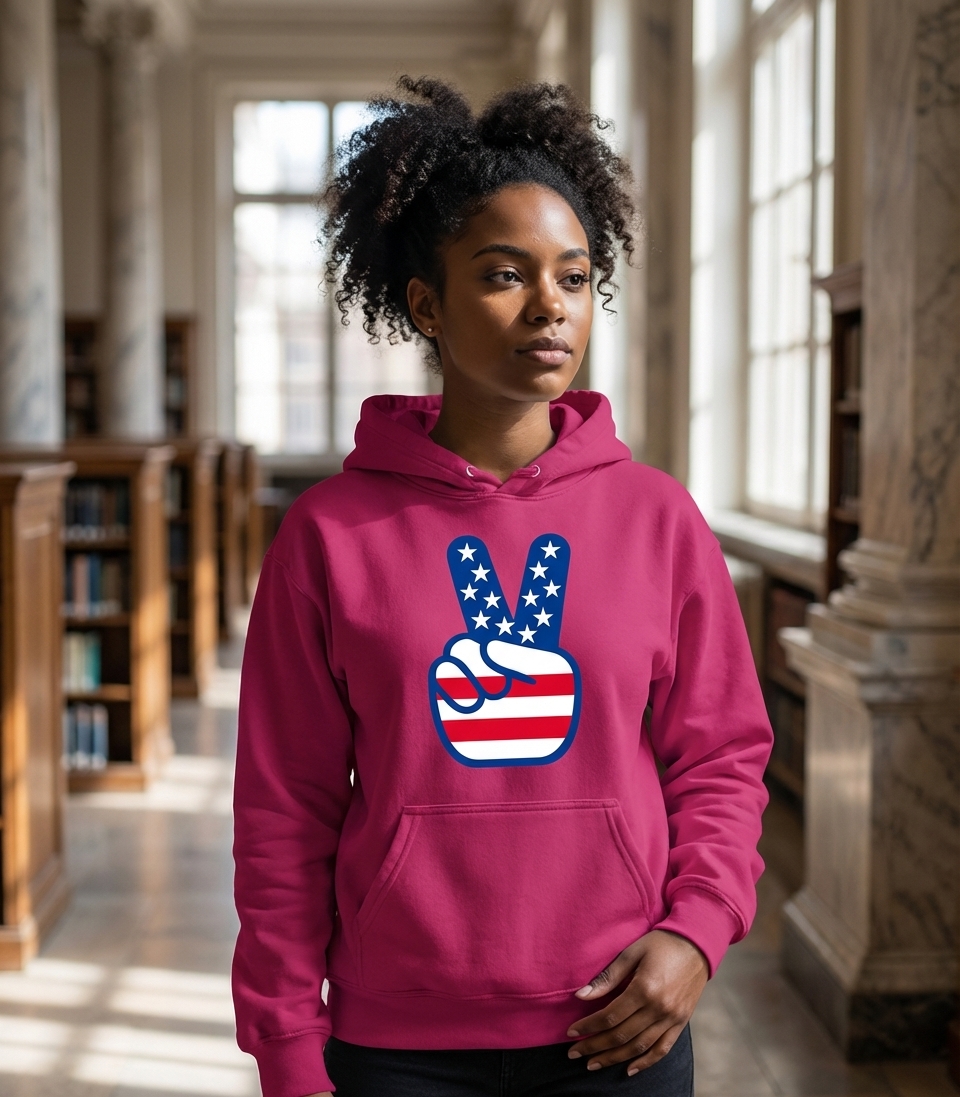 The peace sign is a universally recognized symbol of peace and non-violence. When combined with the American flag, it signifies a deep desire for peace and unity within the nation, embodying core American ideals of freedom, liberty, and collective harmony.