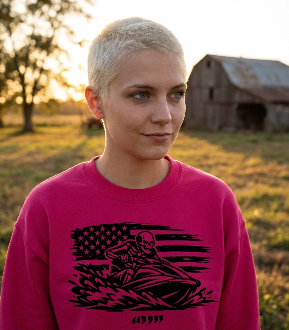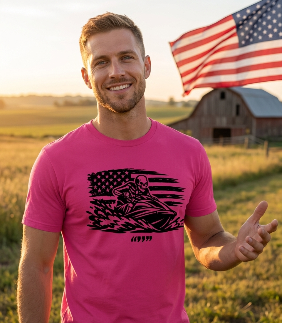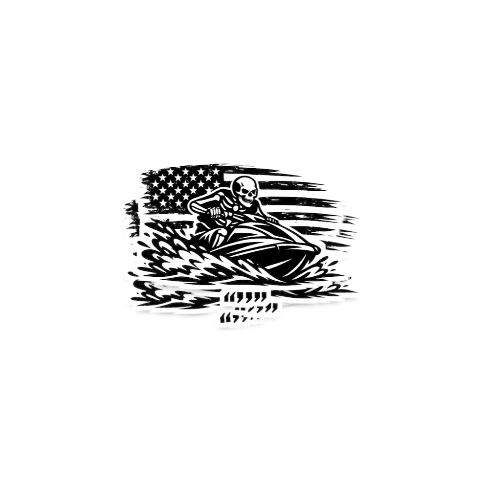 The imagery conveys a sense of fearless patriotism and a dedication to adrenaline-fueled outdoor pursuits. It speaks to a spirit of independence and a willingness to embrace challenges, all while showing allegiance to American values. The skeleton rider symbolizes a tough, enduring approach to life.