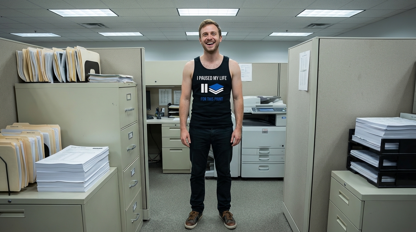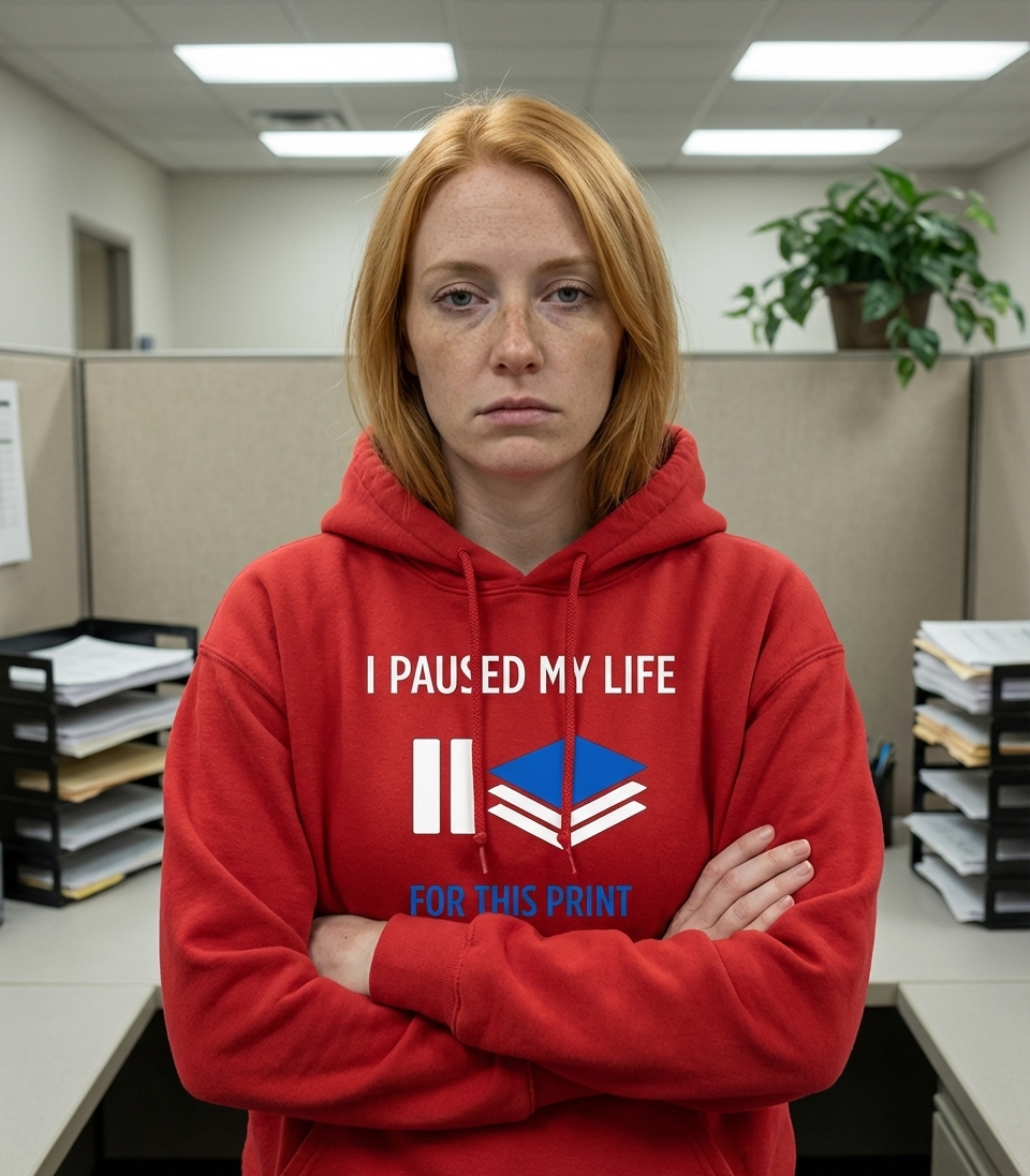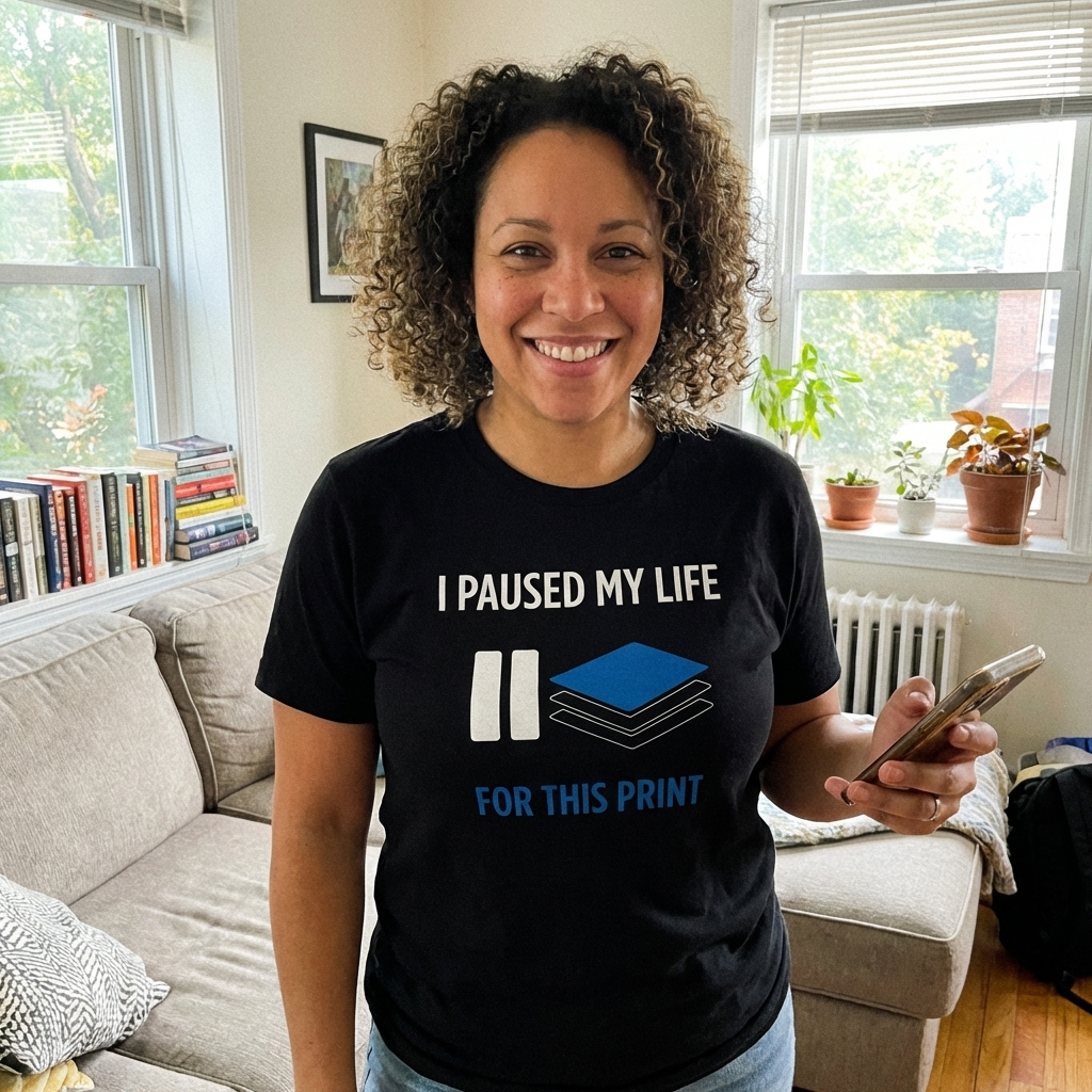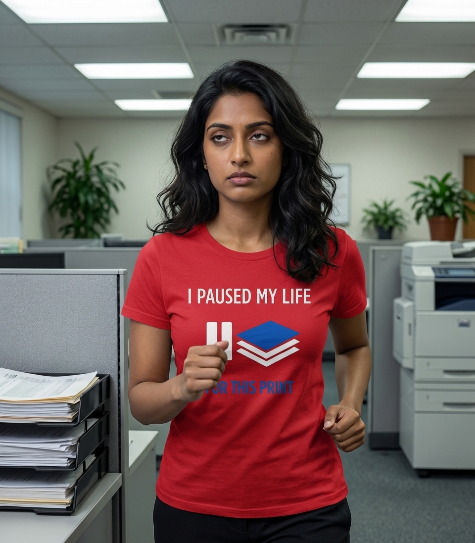 The 'I Paused My Life For This Print' phrase captures the daily grind of office workers, students, and anyone experiencing the universal frustration of waiting for documents to print.