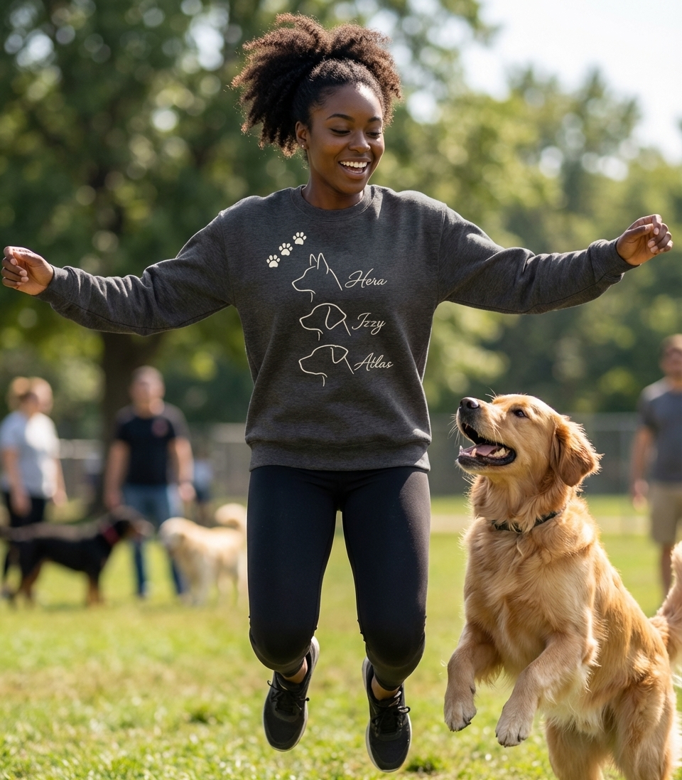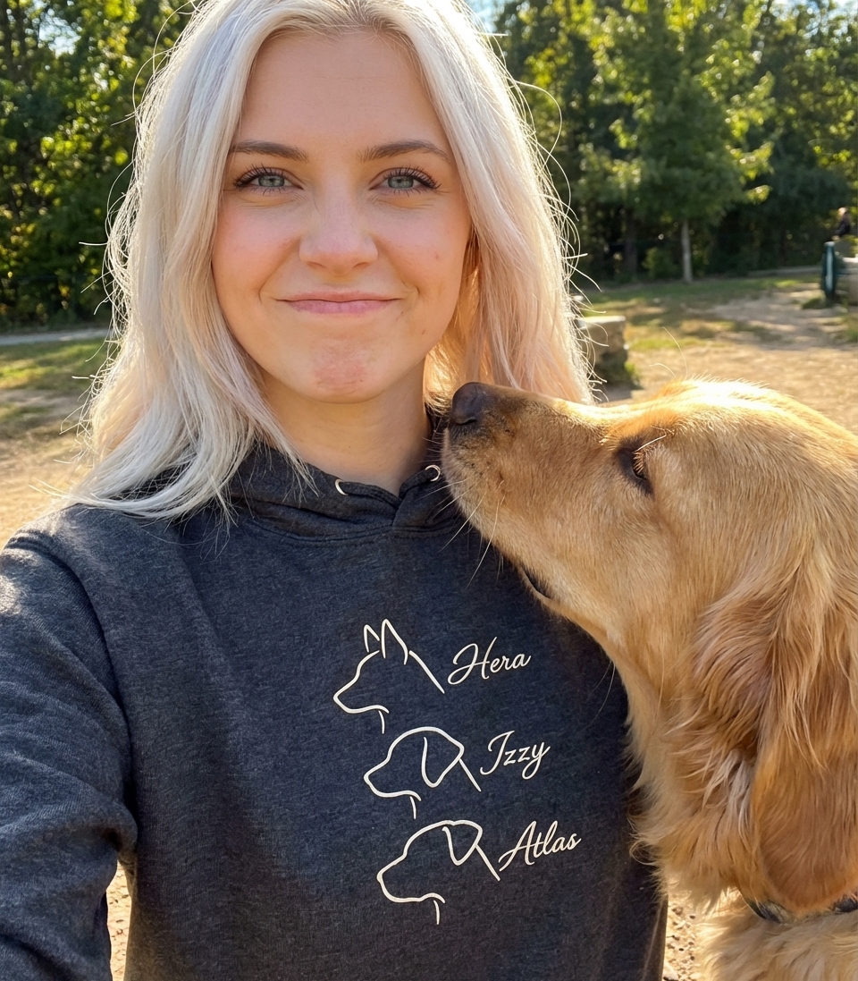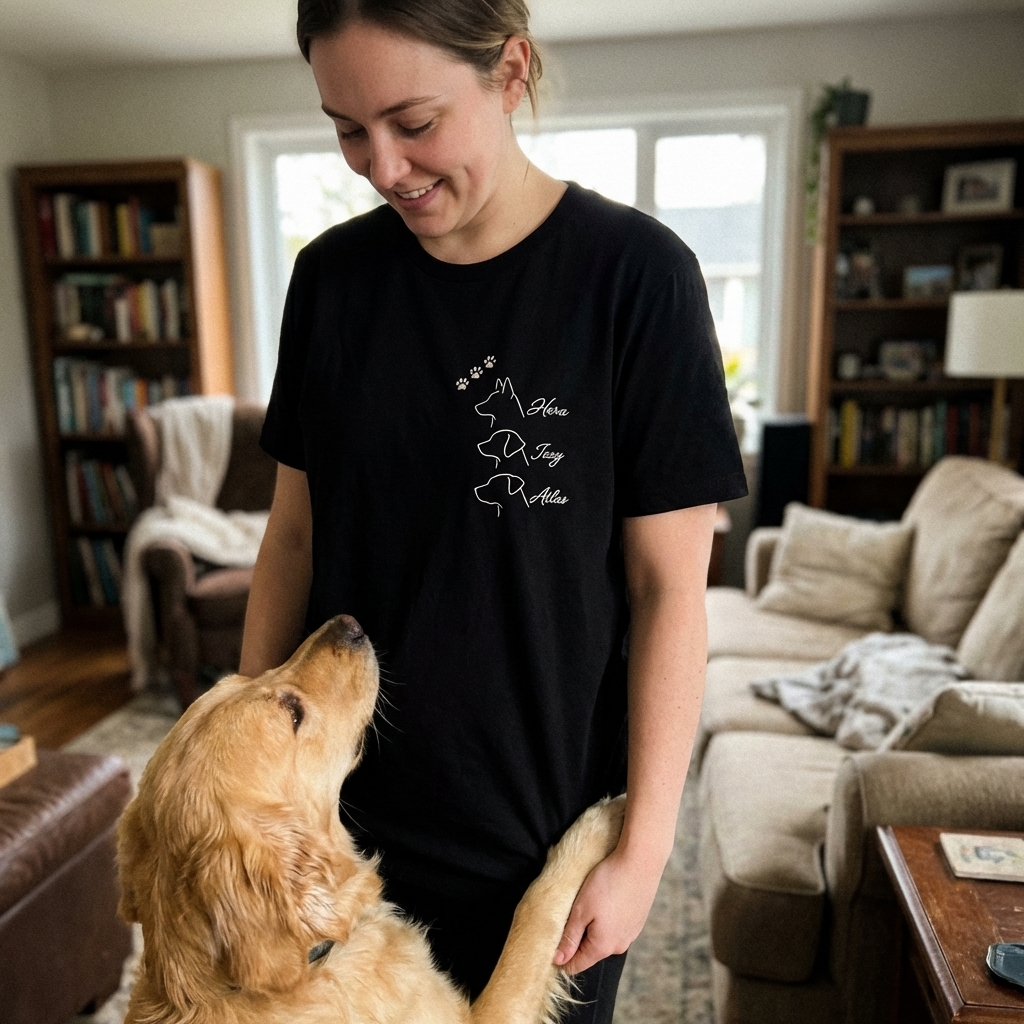 This design showcases the bond between pet owners and their dogs through elegant line art. It features three distinct dog profiles, each accompanied by a cherished name and adorable paw prints, symbolizing the unique personality and presence of each canine companion.