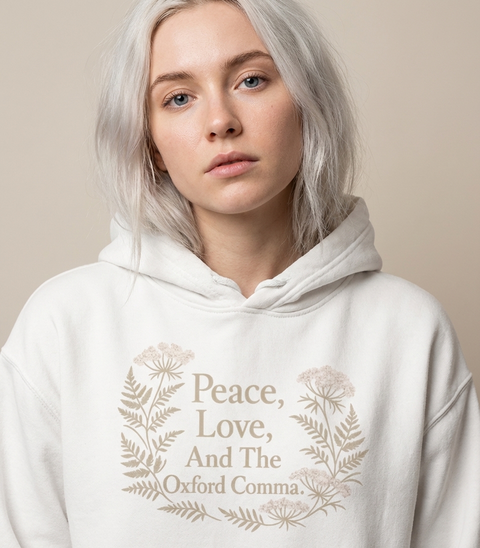 The "Peace, Love, And The Oxford Comma" phrase captures the lifestyle of passionate writers, editors, and grammar enthusiasts who spend their days creating clear sentences, advocating for punctuation, and appreciating linguistic precision.