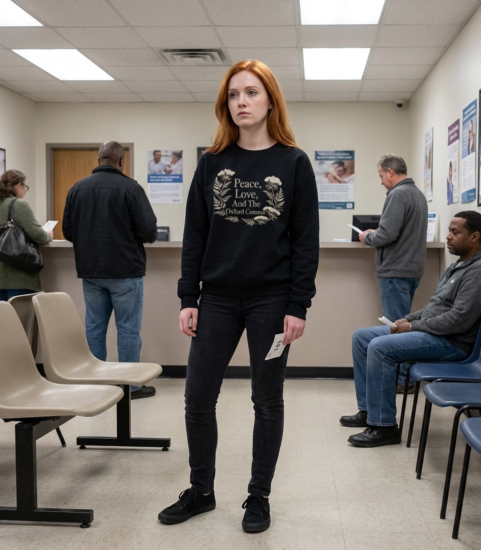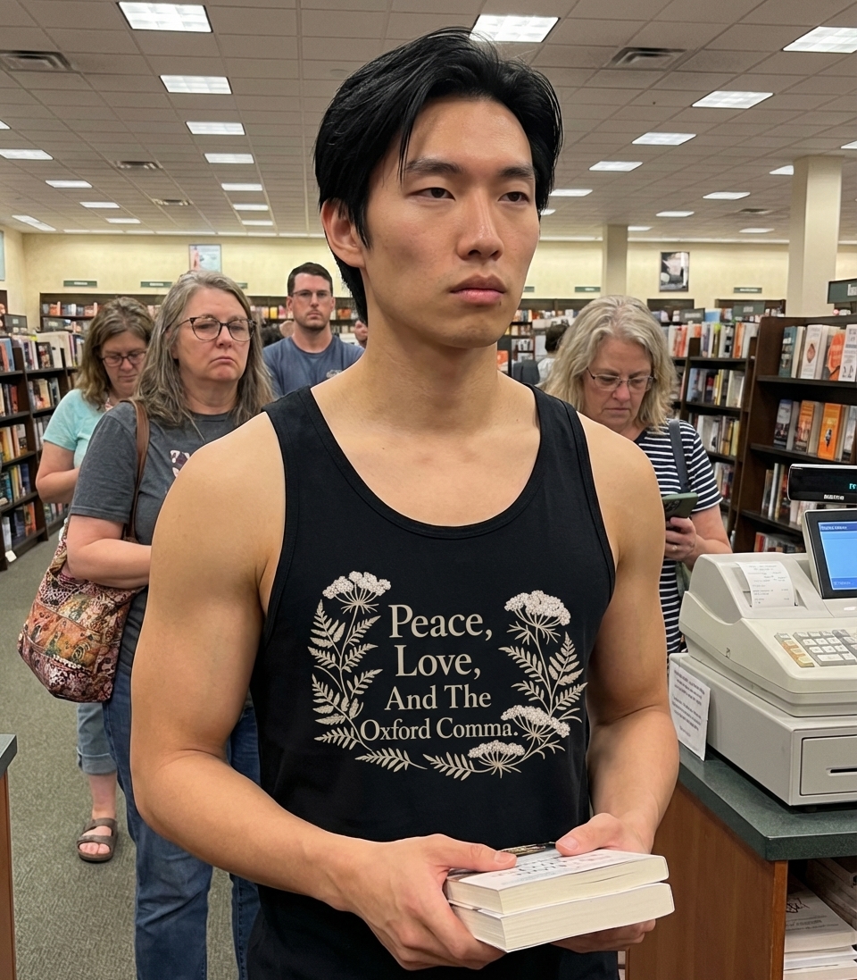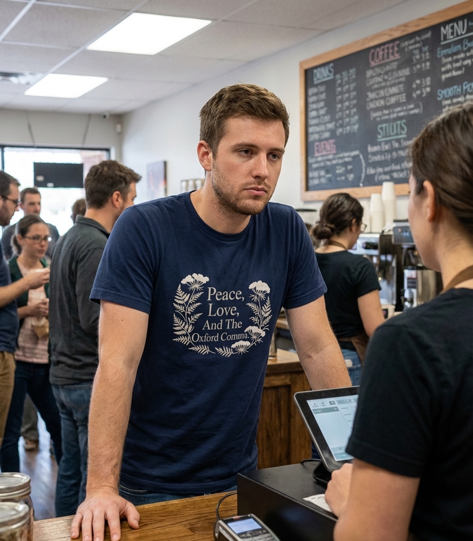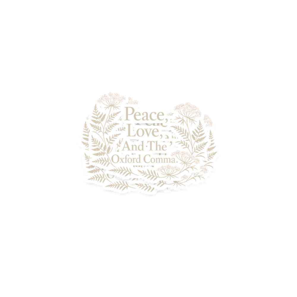 This design playfully combines classic themes of peace and love with a strong stance on grammar. It features elegant floral artwork framing a witty statement. The artwork celebrates precision in language.
