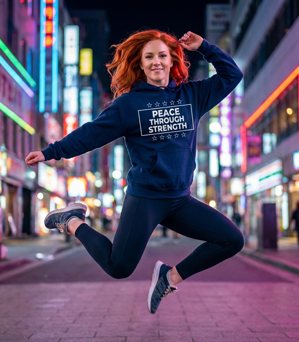 The 'Peace Through Strength' phrase captures the resolute stance of patriots who advocate for national defense, safeguard liberty, and uphold the principles of freedom.