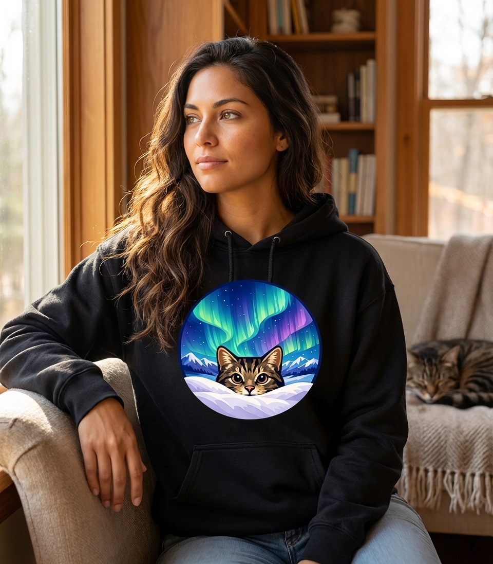 The Peeking Cat Northern Lights design captures the wonder of passionate cat lovers who admire winter beauty, celestial phenomena, and cute animal artistry.