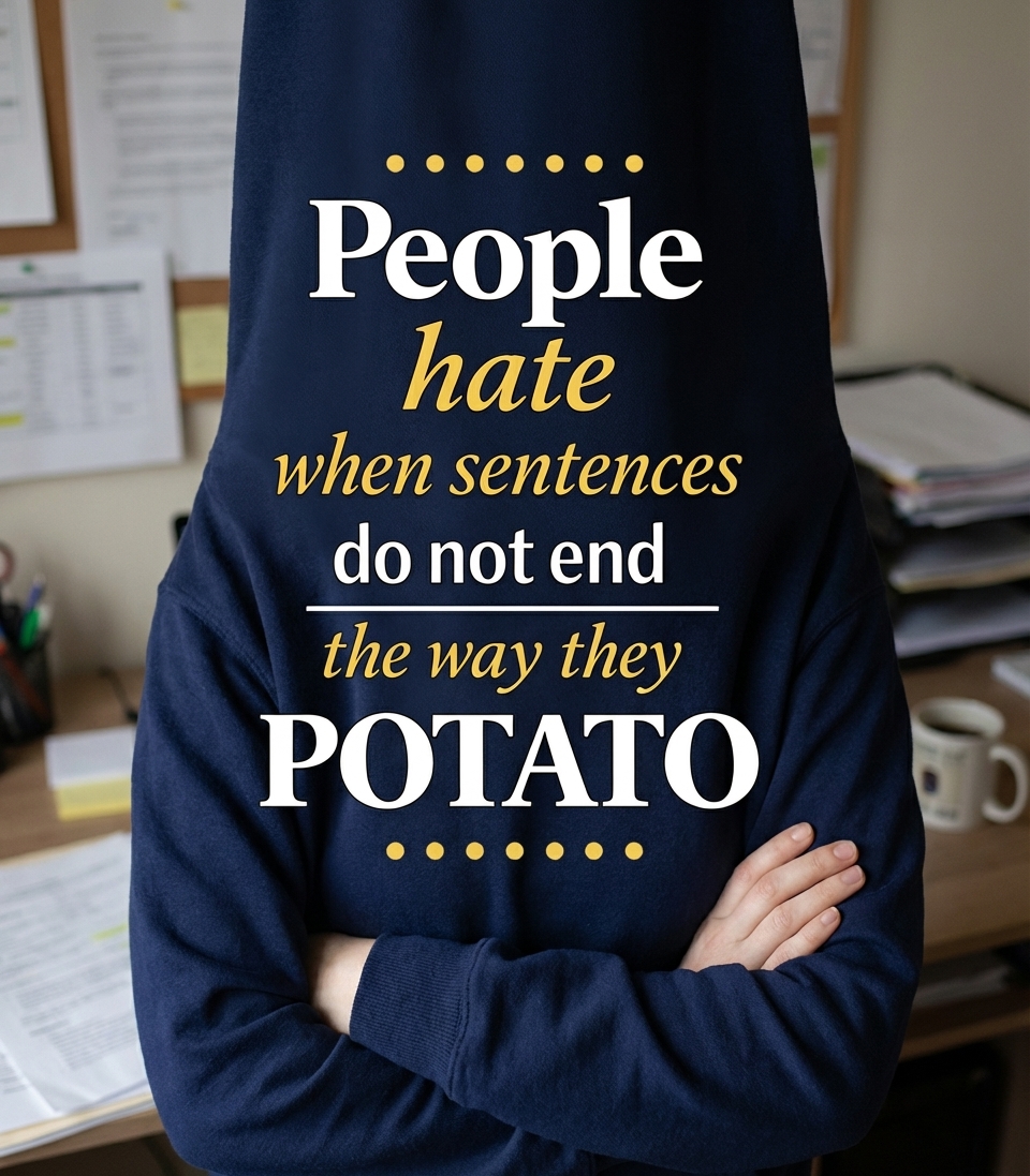 The phrase "People hate when sentences do not end the way they POTATO" is a classic example of absurdist humor and wordplay. It highlights the frustration of unmet expectations in language by intentionally replacing an anticipated word with the utterly random and comical "POTATO," creating an amusing and memorable twist.