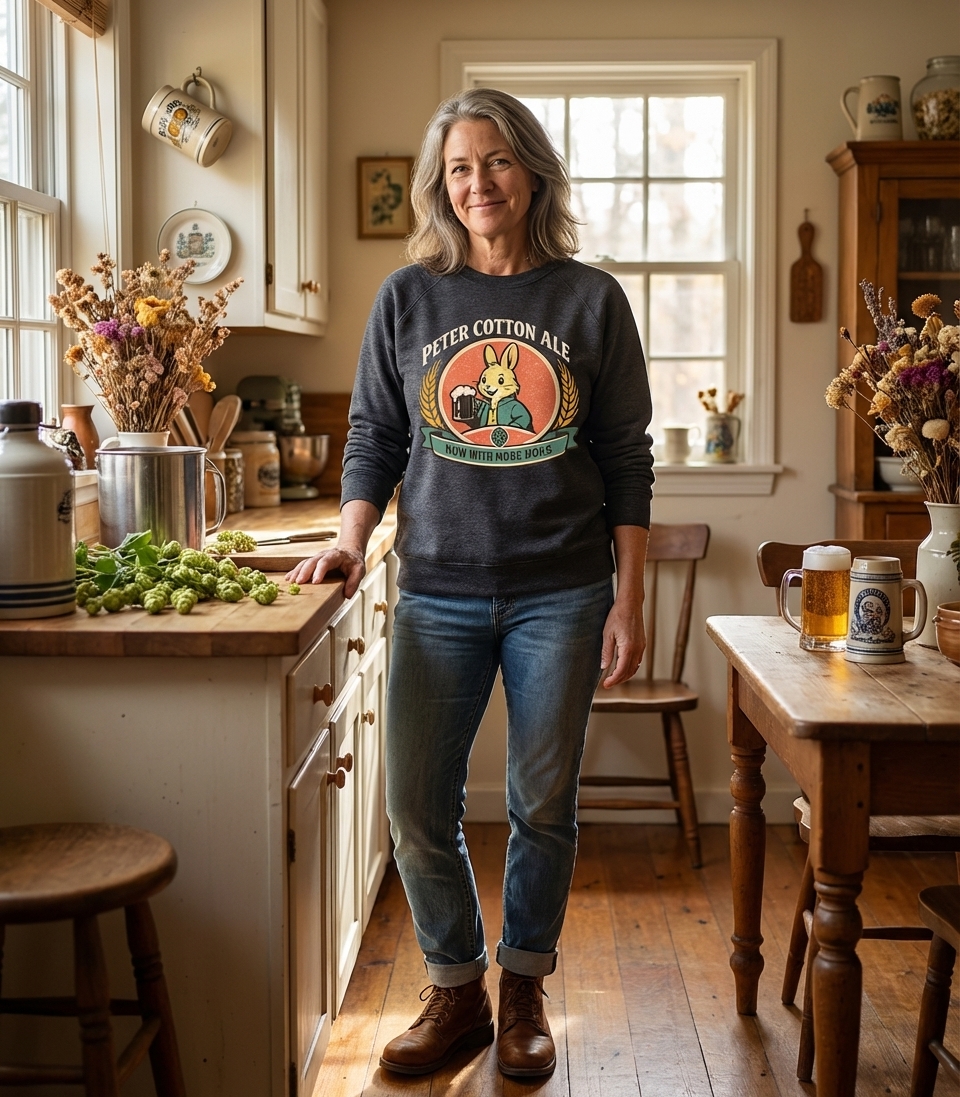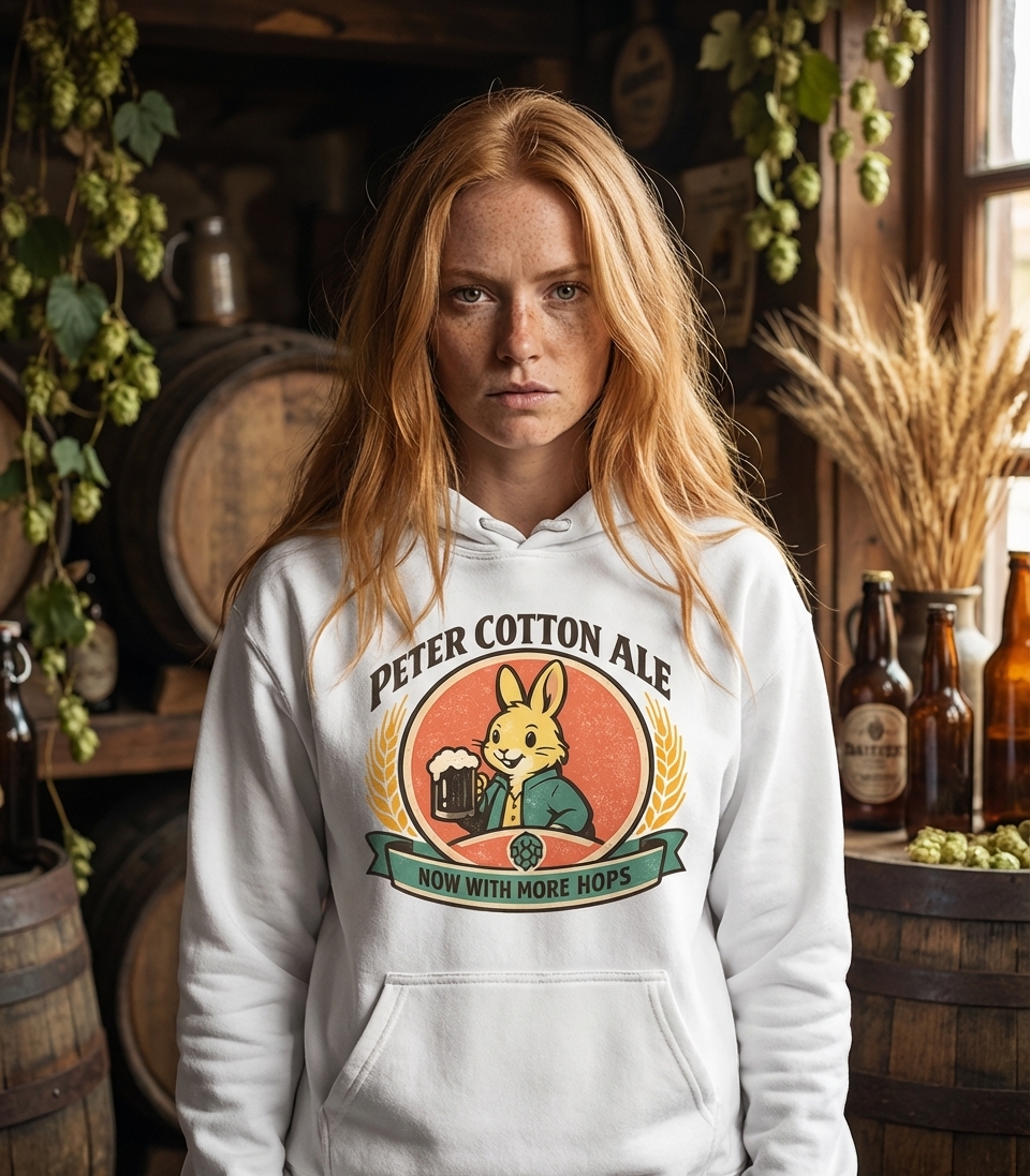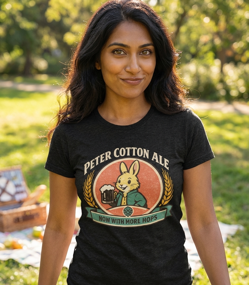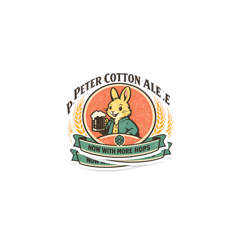 The phrase "Peter Cotton Ale" is a playful pun on the well-known children's character "Peter Cottontail". This clever wordplay extends further with "Now With More Hops," referring both to a rabbit's natural movement and the essential ingredient in beer brewing.