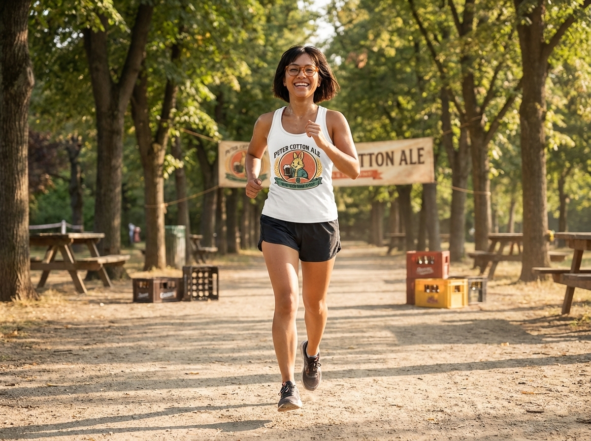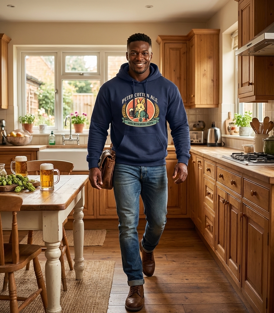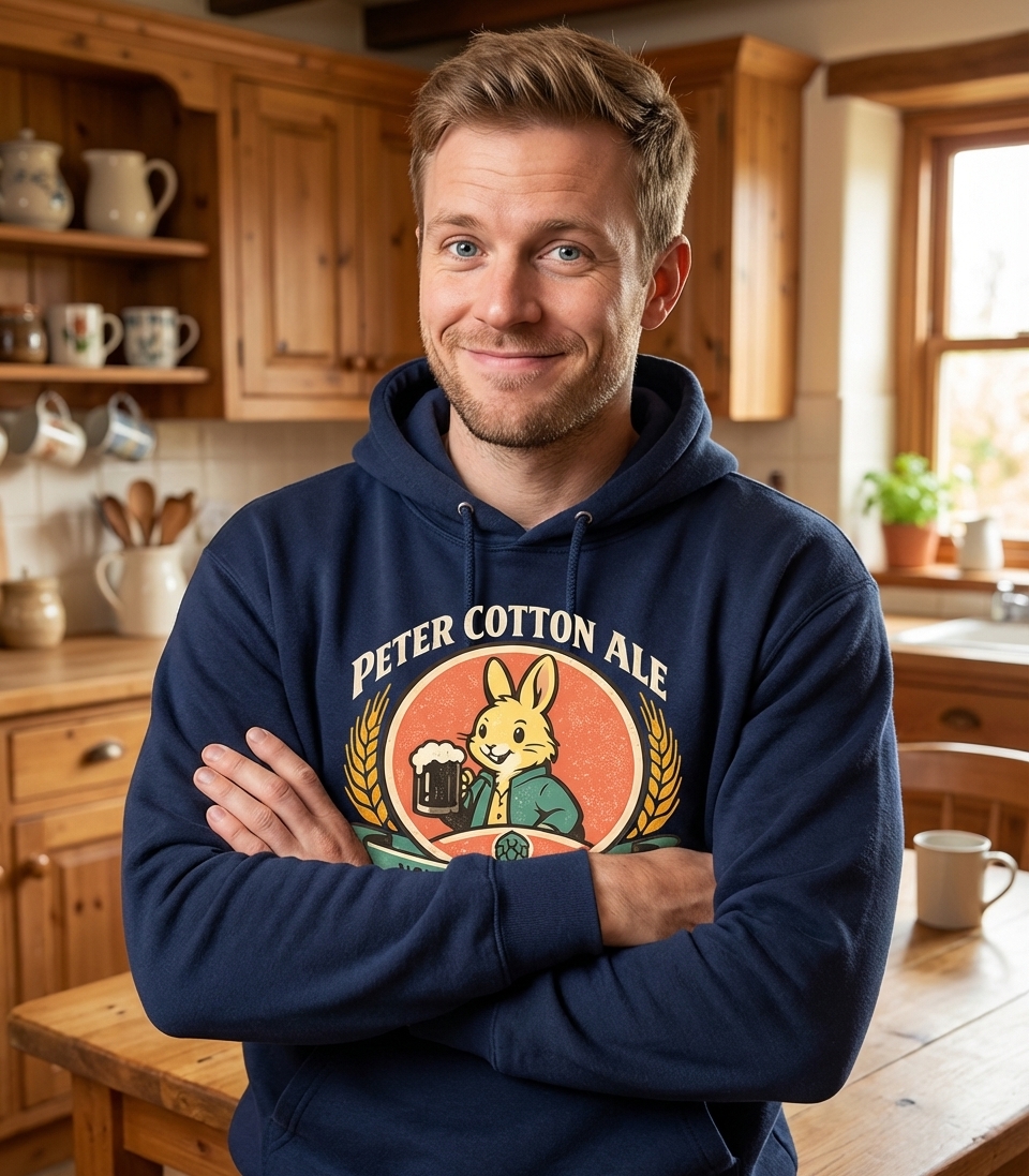 The phrase "Peter Cotton Ale" is a playful pun on the well-known children's character "Peter Cottontail". This clever wordplay extends further with "Now With More Hops," referring both to a rabbit's natural movement and the essential ingredient in beer brewing.