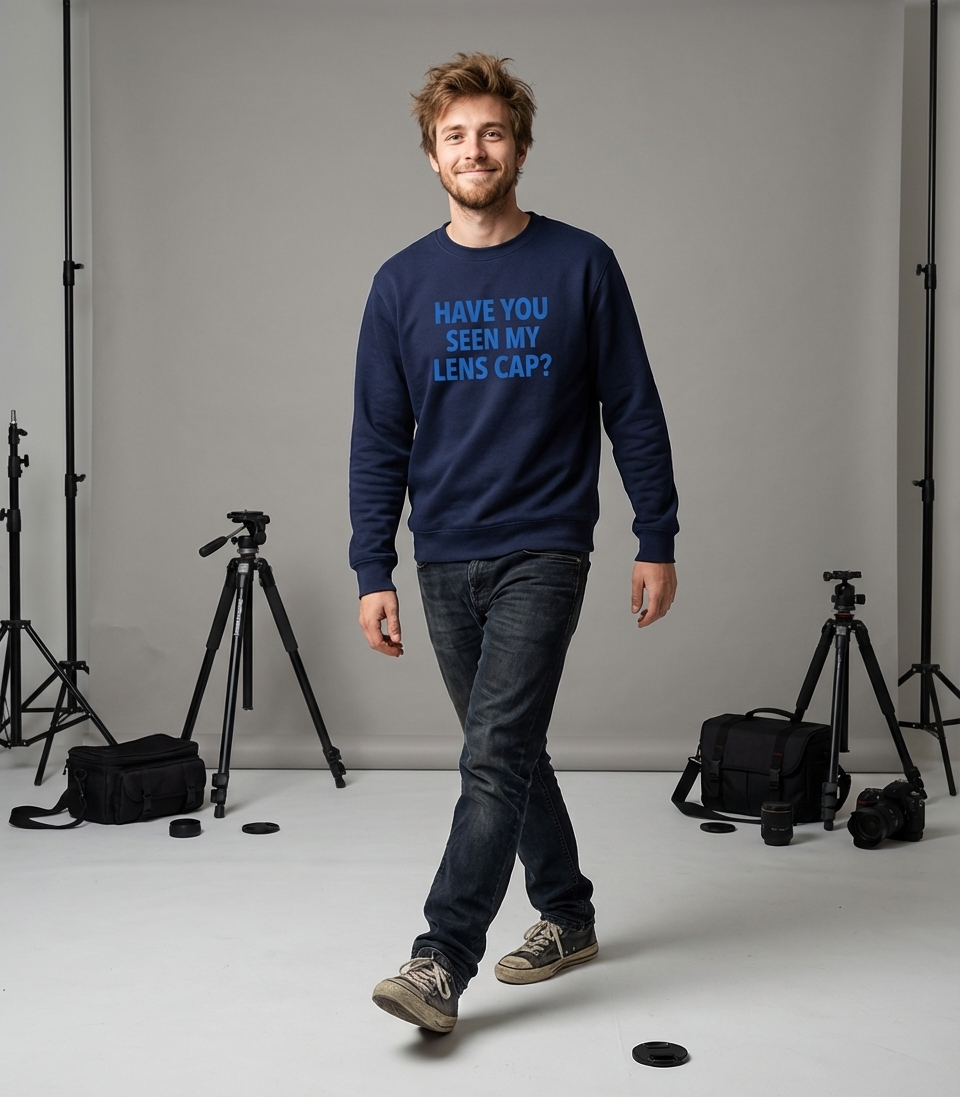 The 'Have You Seen My Lens Cap' phrase captures the relatable struggle of passionate photographers who spend their days capturing moments, focusing on details, and often misplacing essential gear.