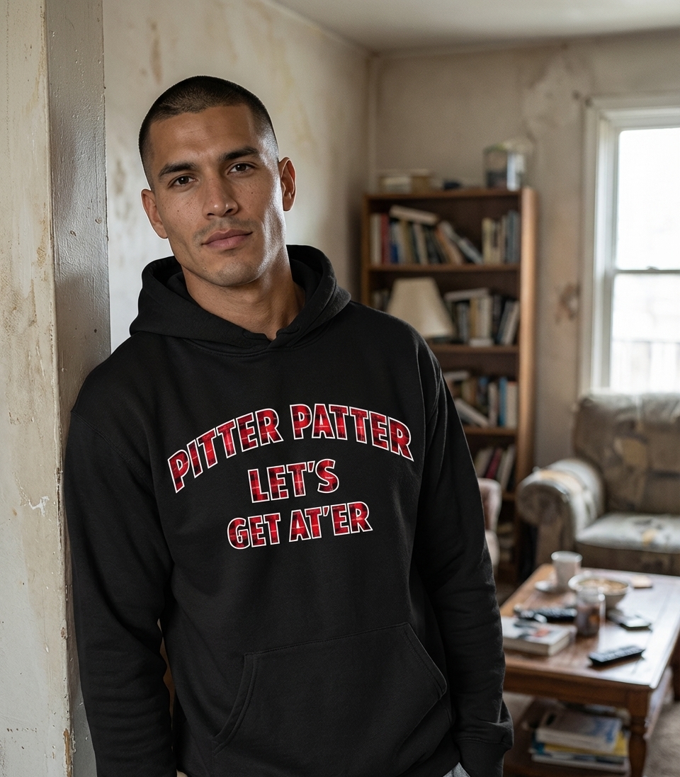 The "Pitter Patter Let's Get At'er" phrase captures the lifestyle of those who embrace hard work, playful motivation, and getting things done.