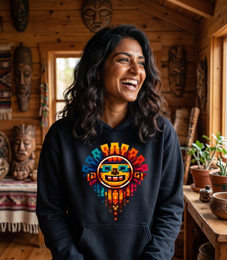 The design itself, "Pixel Aztec Sun," references the iconic sun stone and deity representations found in Mesoamerican cultures, particularly the Aztecs. The pixelated execution adds a modern, digital twist, suggesting a love for classic video games and nostalgic 8-bit graphics. It's a fusion of historical reverence and digital fun.
