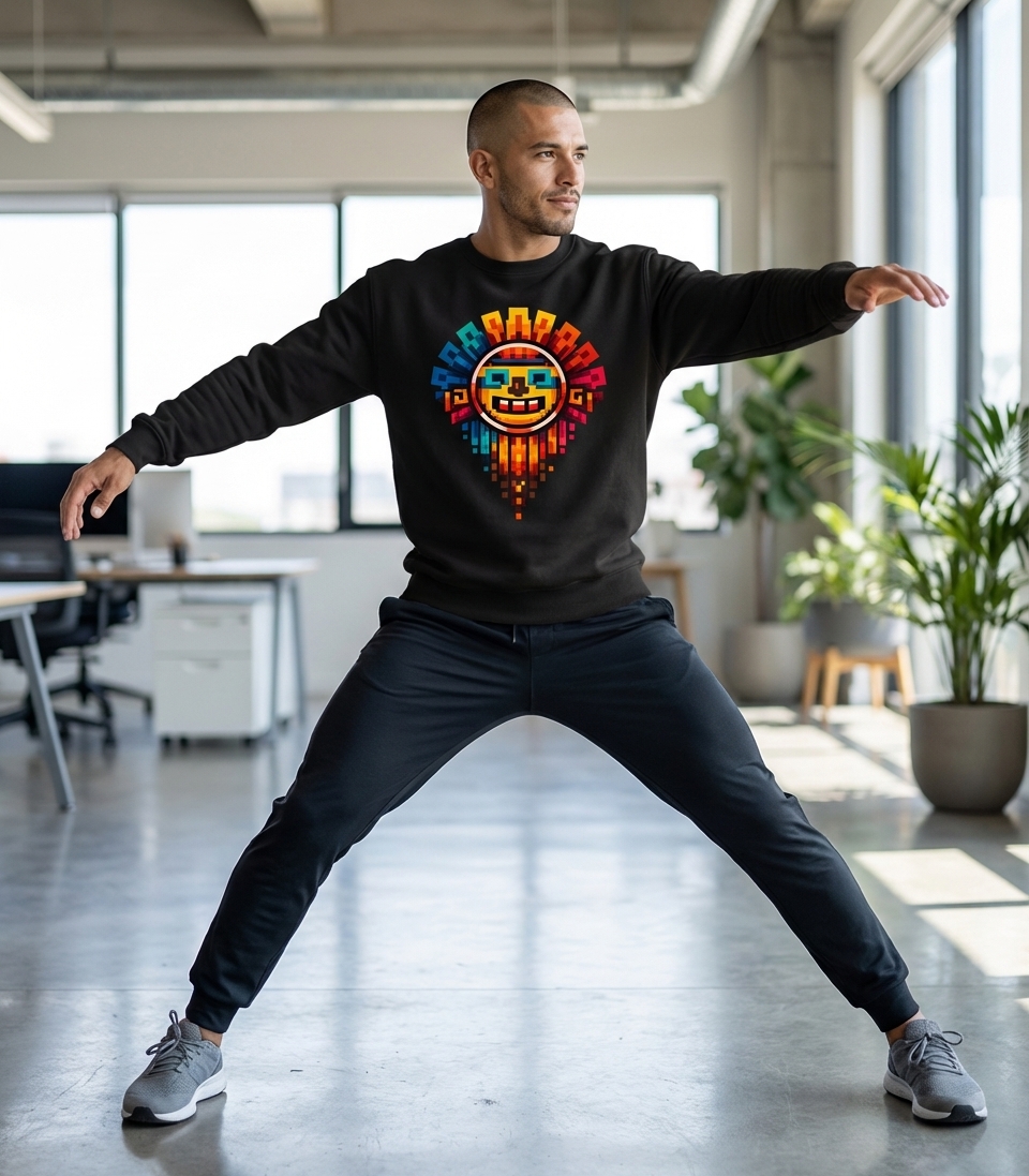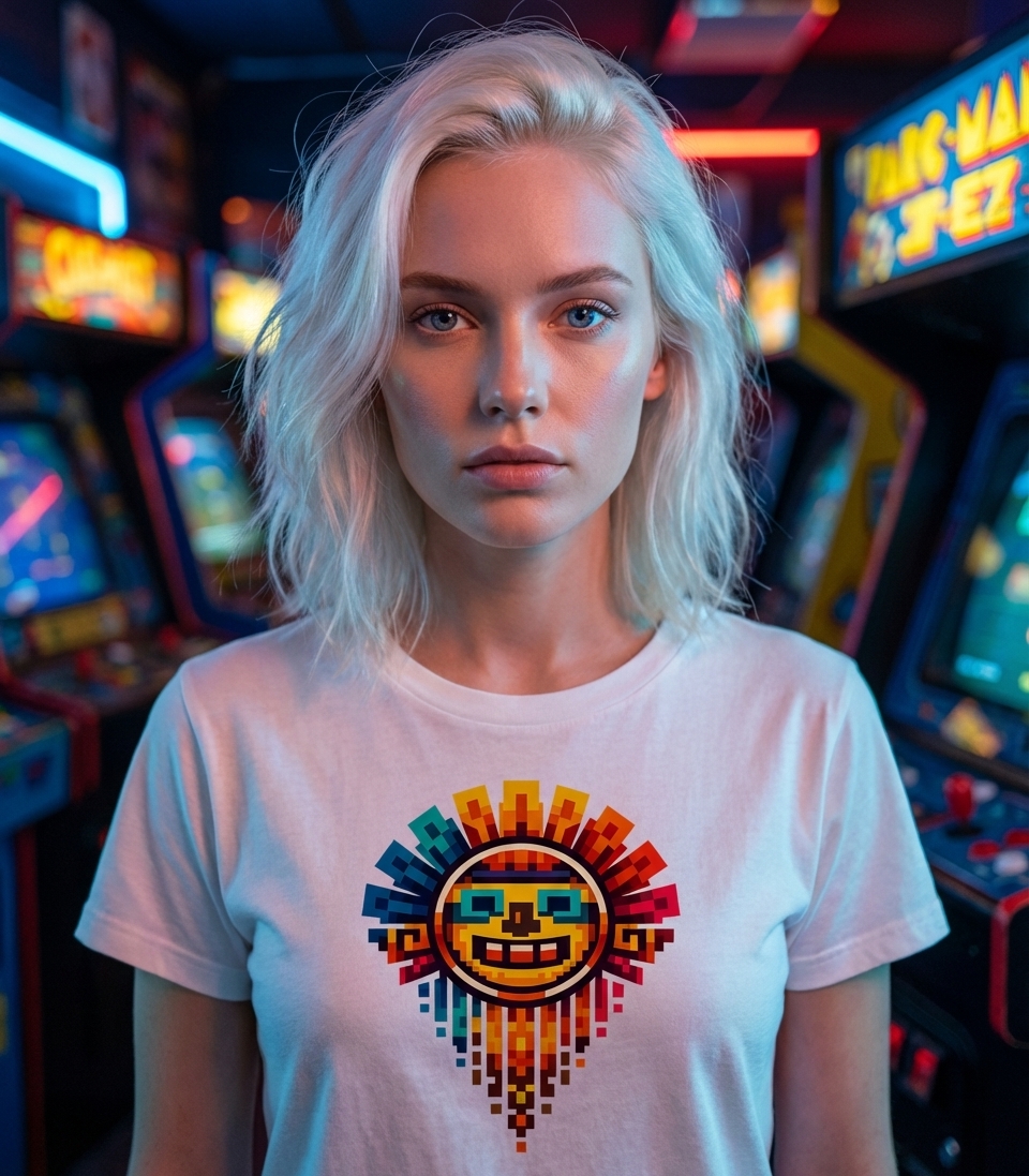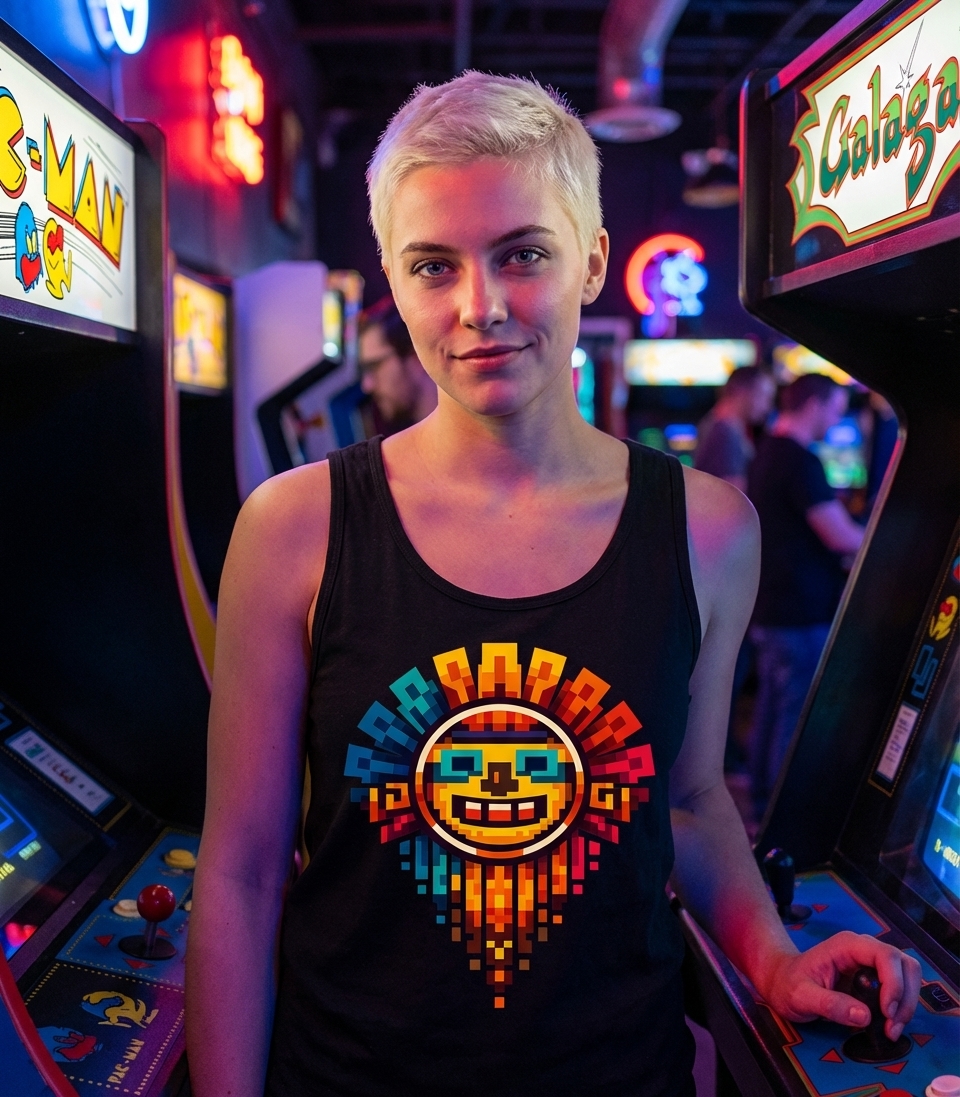 The "Pixel Aztec Sun" design captures the vibrant energy of enthusiasts who appreciate ancient cultural art rendered in a fun, retro 8-bit gaming style.