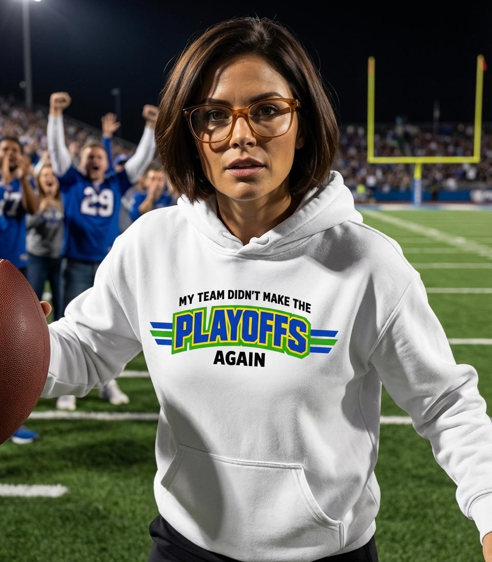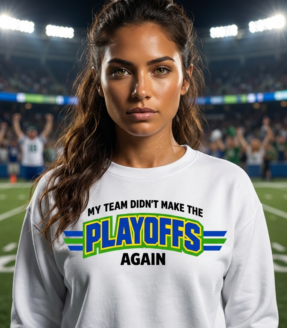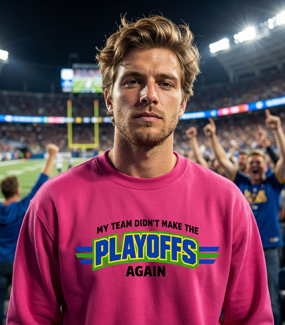 The "Playoffs" phrase captures the lifestyle of passionate sports enthusiasts who spend their days cheering for their team, tailgating, and anticipating championship victories.
