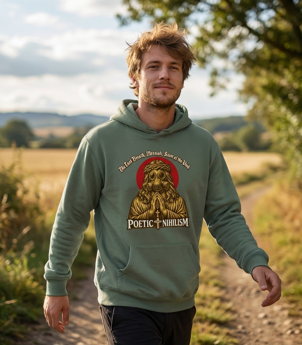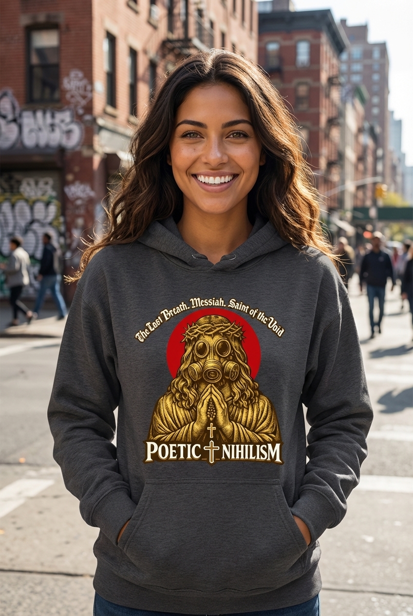 The "Poetic Nihilism Messiah" design captures the contemplative lifestyle of those who explore existential questions, appreciate dark art, and question conventional meanings.